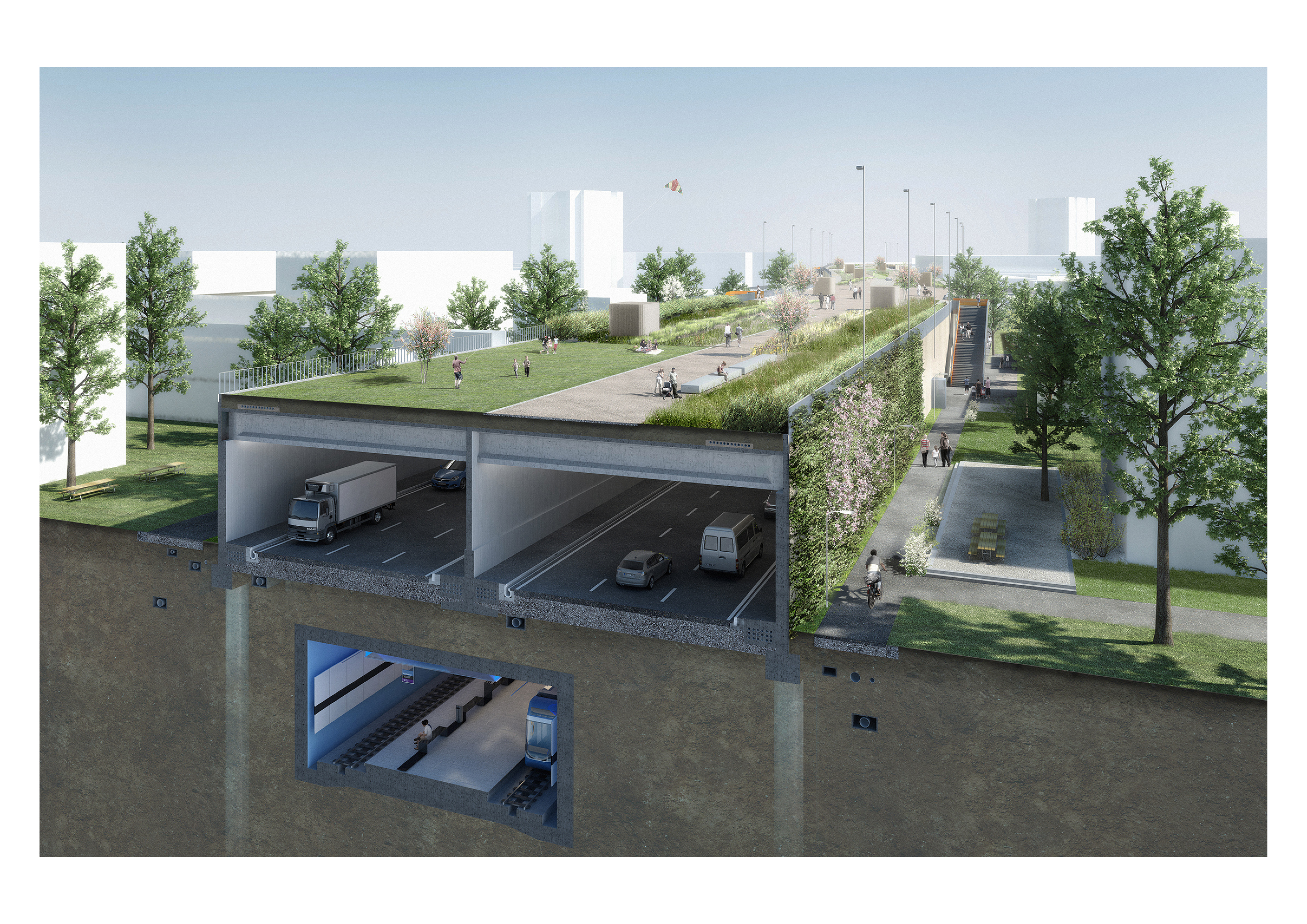 Die nachhaltige Stadtreparatur durch die Einhausung führt zur stadträumlichen und ökonomischen Aufwertung der angrenzenden Quartiere und begünstigt deren Innenentwicklung und Verdichtung. Material und Konstruktion von Bauwerk, Zugängen, Parkeinbauten und auch die Vegetation sind ausgelegt auf Robustheit, Langlebigkeit und Einfachheit im Unterhalt. Einfache Massnahmen innerhalb der vorgesehenen Bauweise, wie die Aufrauhung der Aussenwände, erzeugen kosteneffizient einen gestalterischen Mehrwert.