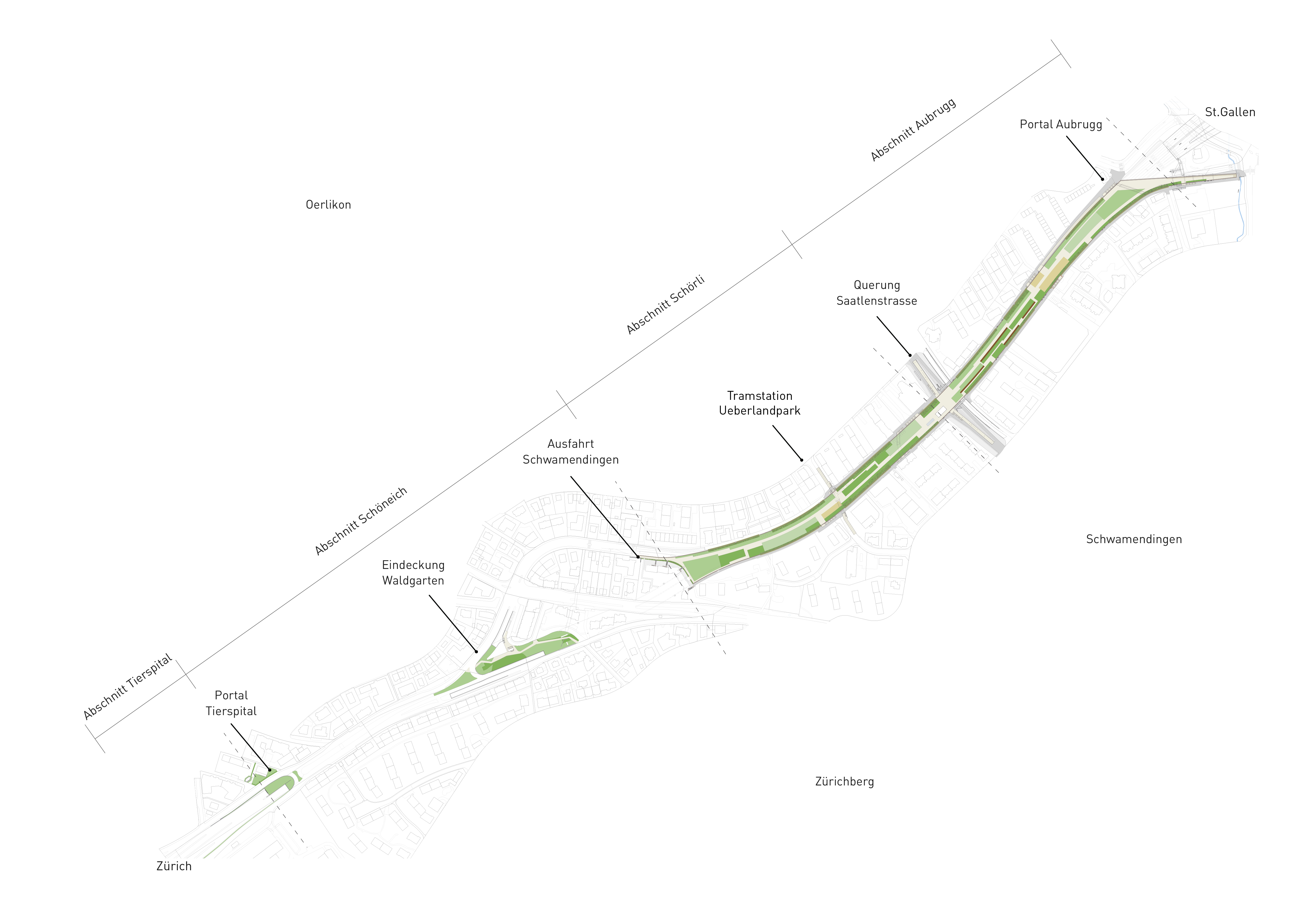 Die Einhausung zeigt sich auf vielfältige Art. Aus der Vogelperspektive als in das dichte Stadtgefüge eingebettete Grossform. Ihr Portal Aubrugg bildet das markante Tor zur Stadt und führt in den zweckdienlichen Tunnel. Dessen Entrauchungsbauwerke bilden überraschende Ausläufer im beruhigten Stadtraum. Als begrünte Stadtmauer wird sie vom Quartier aus wahrgenommen und der Ueberlandpark schafft ein einzigartiges Idyll mit einer Fülle von neuen Orten und Biotopen.