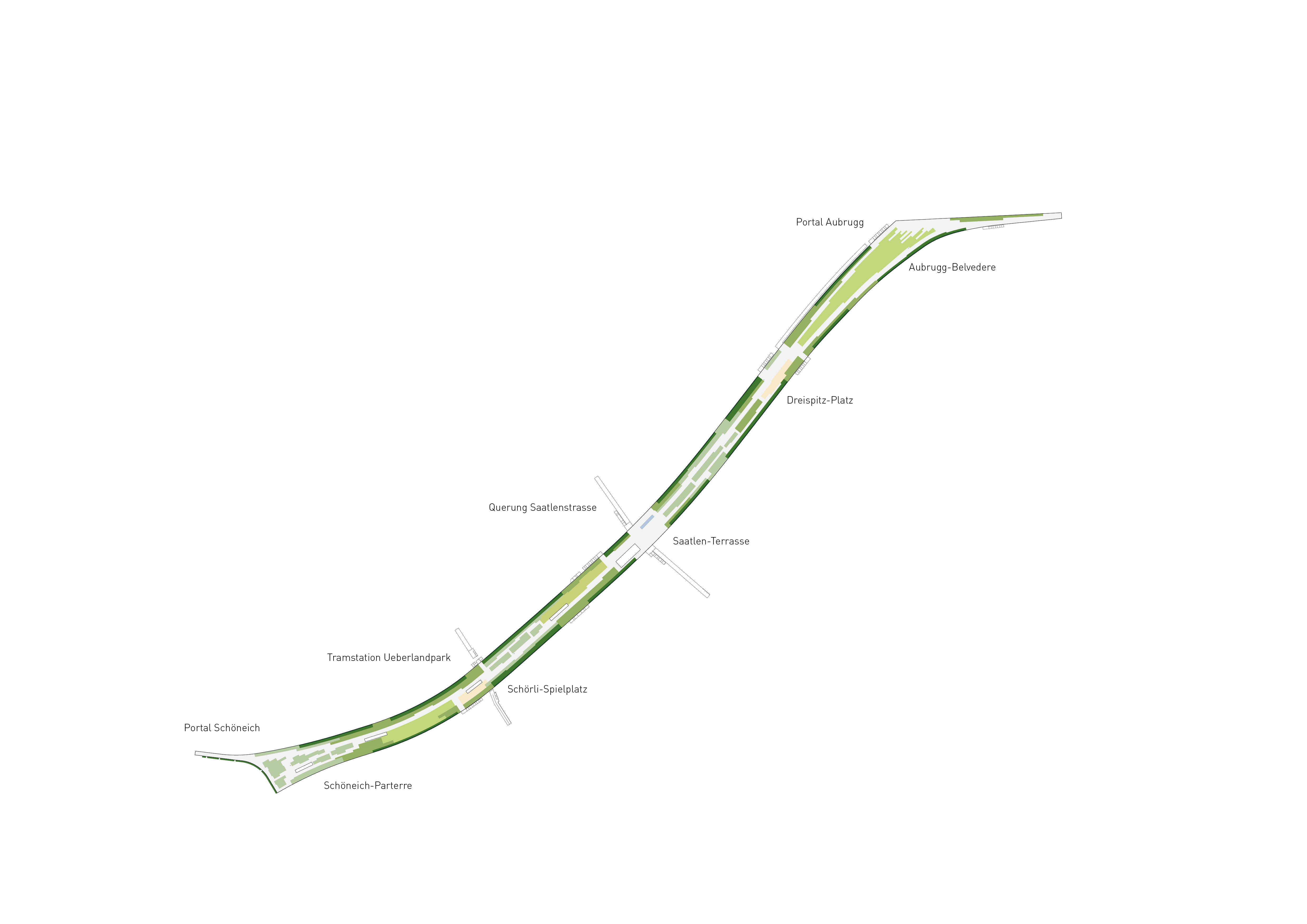 Einhausung und Ueberlandpark verbinden als stadtlandschaftliches Element grossräumlich Zürichberg und Glatttal. Sie verzahnen sich durch Aufgänge, Unterführungen und flankierende Wege mit dem angrenzenden Stadtraum, verschliessen die Wunde der Verkehrsschneise und verbinden so das geteilte Quartier. Der Ueberlandpark bereichert das Quartier sozialräumlich durch seine Nutzungsvielfalt und den Pavillon.