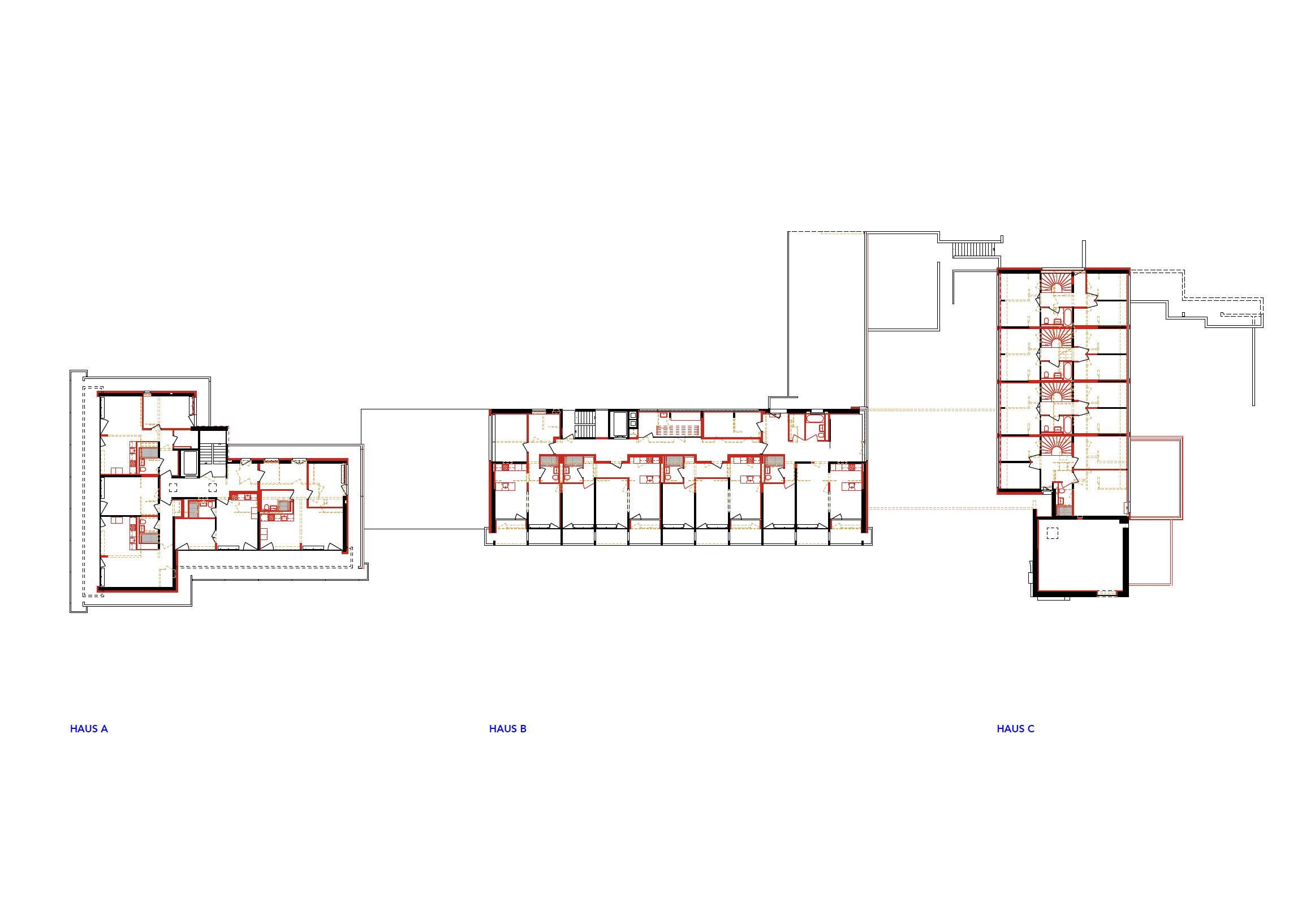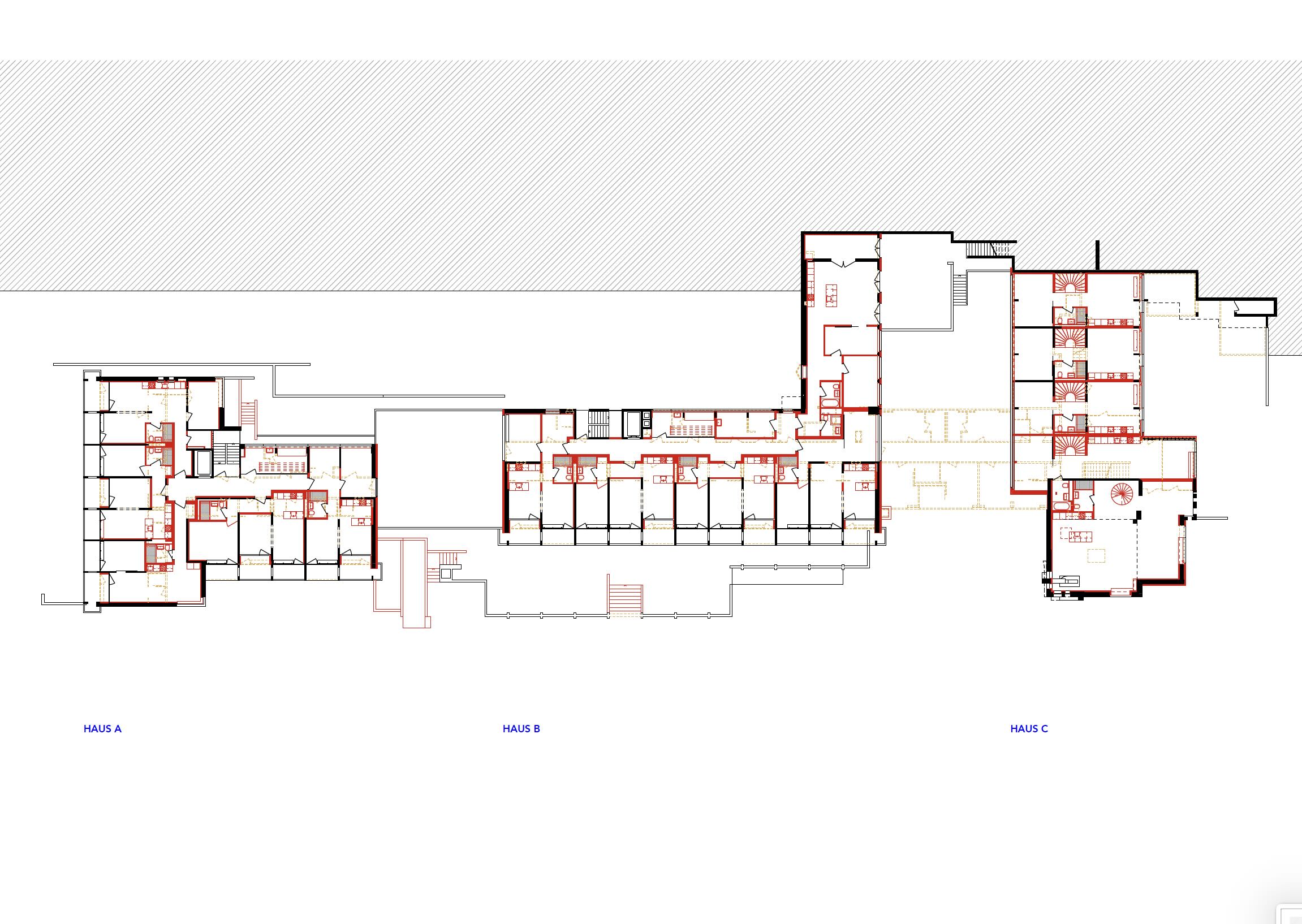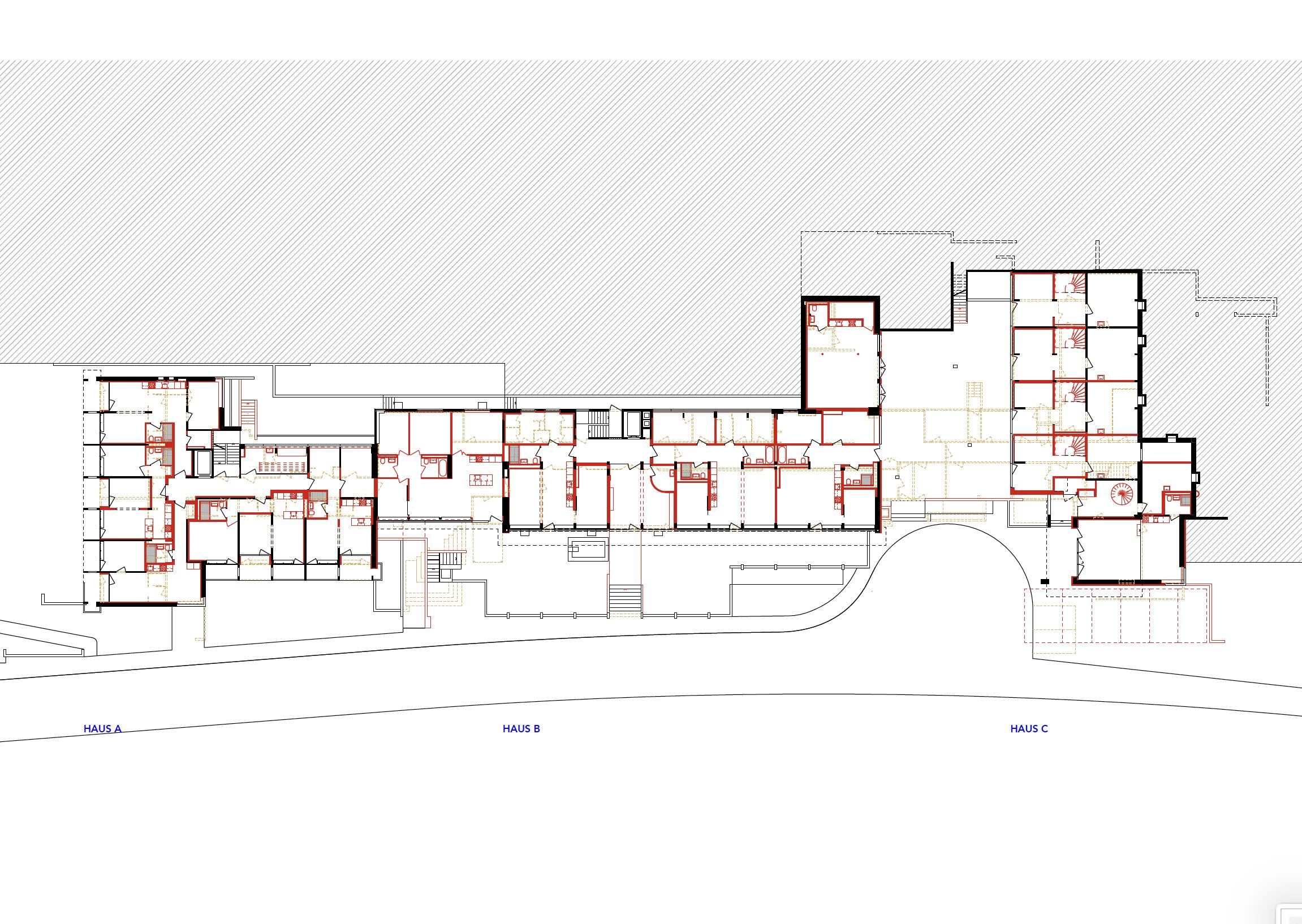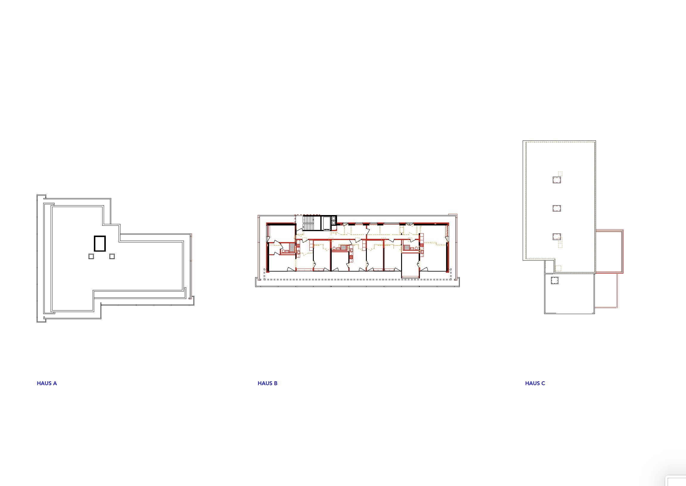Das ehemalige Pflegeheim wird in 34 Wohnungen und vier Reiheneinfamilienhäuser transformiert. Durch die Reorganisation der Schottenstruktur entstehen flexible, gut nutzbare Grundrisse, ergänzt durch gemeinschaftliche Räume und einen öffentlich zugänglichen Quartierplatz.