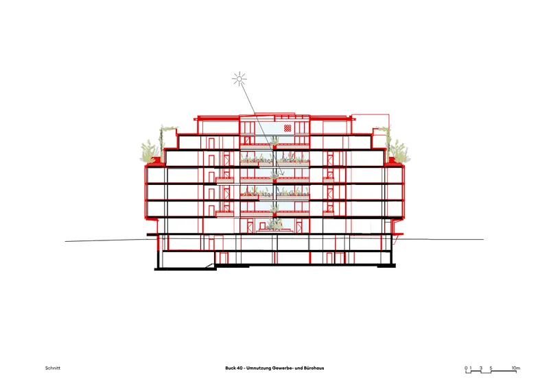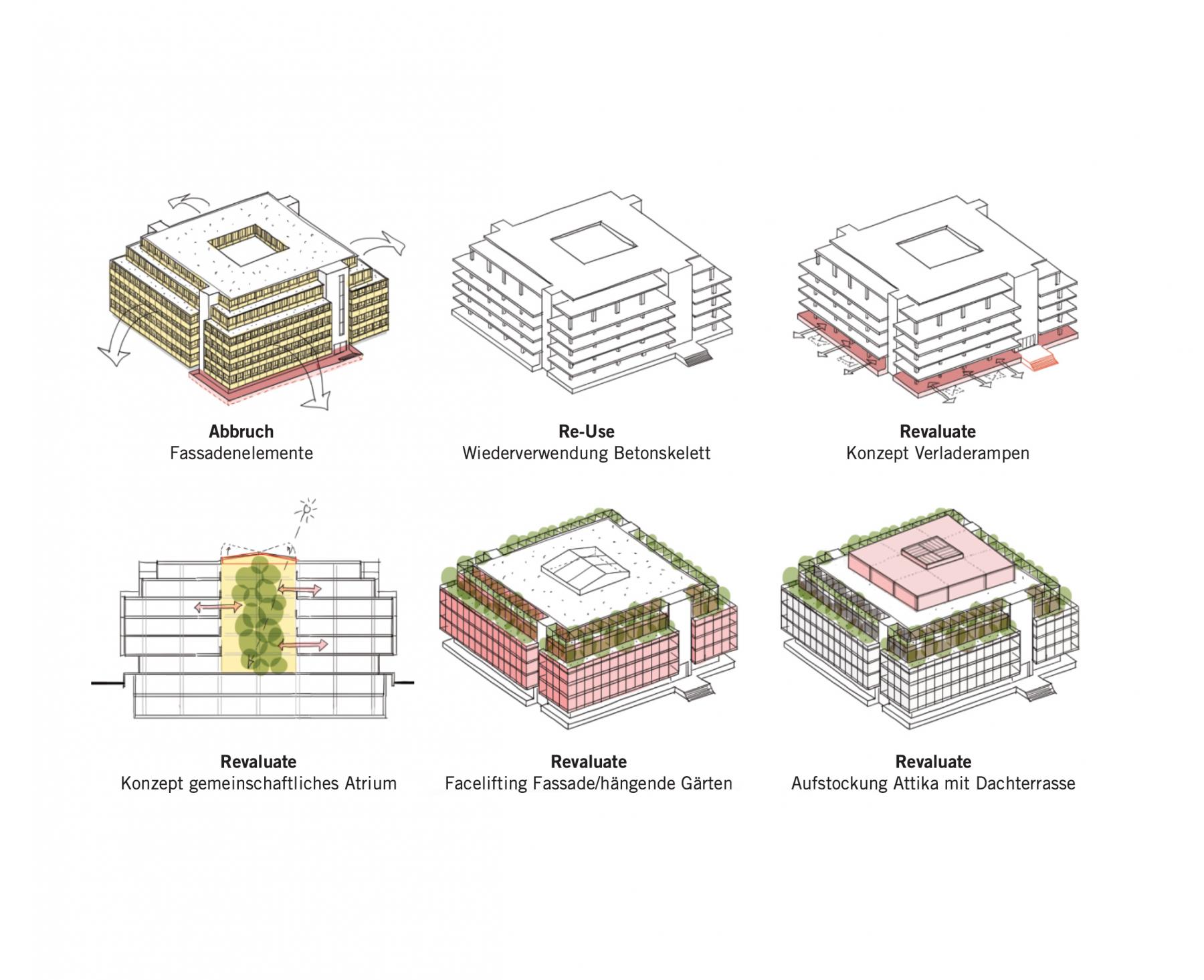 Die Grundhaltung «Reuse, Reduce, Revaluate» bildet die konzeptionelle Basis des Entwurfs und definiert dessen wesentliche Parameter. Durch gezielte architektonische Eingriffe werden Adressierung, Ausdruck sowie die innere Organisation des Bestands neu gedacht. Das Bauwerk wird bis auf seine Tragstruktur zurückgebaut und räumlich geöffnet. In diese Struktur wird ein bis ins Erdgeschoss freigelegtes Atrium eingeschnitten, das als gemeinschaftliches Zentrum der Anlage dient und Begegnung sowie Orientierung fördert. Die bestehenden Auskragungen im Hochparterre werden umgenutzt und als Verladerampen für gewerbliche Nutzungen ausgebildet. Der Baukörper gliedert sich dreiteilig: Auf dem eingezogenen EG kragt ein dreigeschossiger Baukörper mit einer leichten, verglasten Curtain-Wall-Fassade aus. Darüber staffeln sich zurückspringende Attikageschosse mit grosszügig begrünten Dachgärten. Den Abschluss der Volumetrie bildet eine hölzerne, zurückversetzte Aufstockung mit eigenständigem Ausdruck.
