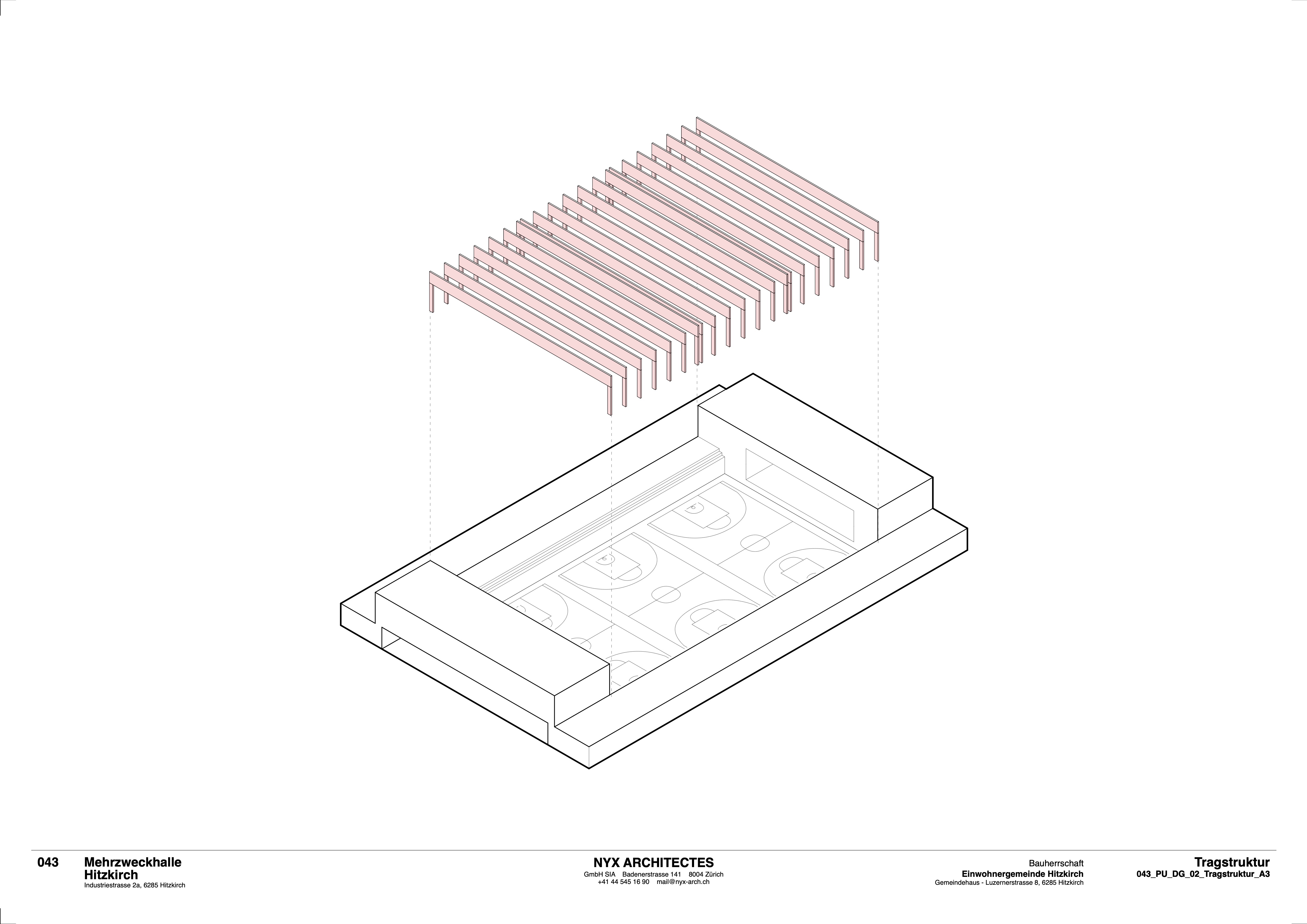 Die Halle ist ein identitätsstiftender Ort für Schule, Sport und Gemeinde. Zentrale Raumfolge: Foyer – Haupthalle – Bühne, flankiert von Annexbauten für dienende Funktionen. Die Haupthalle mit drei Spielfeldern und Zuschauergalerie bildet das räumliche Zentrum; Foyer und Bühne schaffen direkte Verbindungen zum Aussenraum und ermöglichen flexible Nutzung für Schulbetrieb, Vereinsbetrieb und kommunale Anlässe.