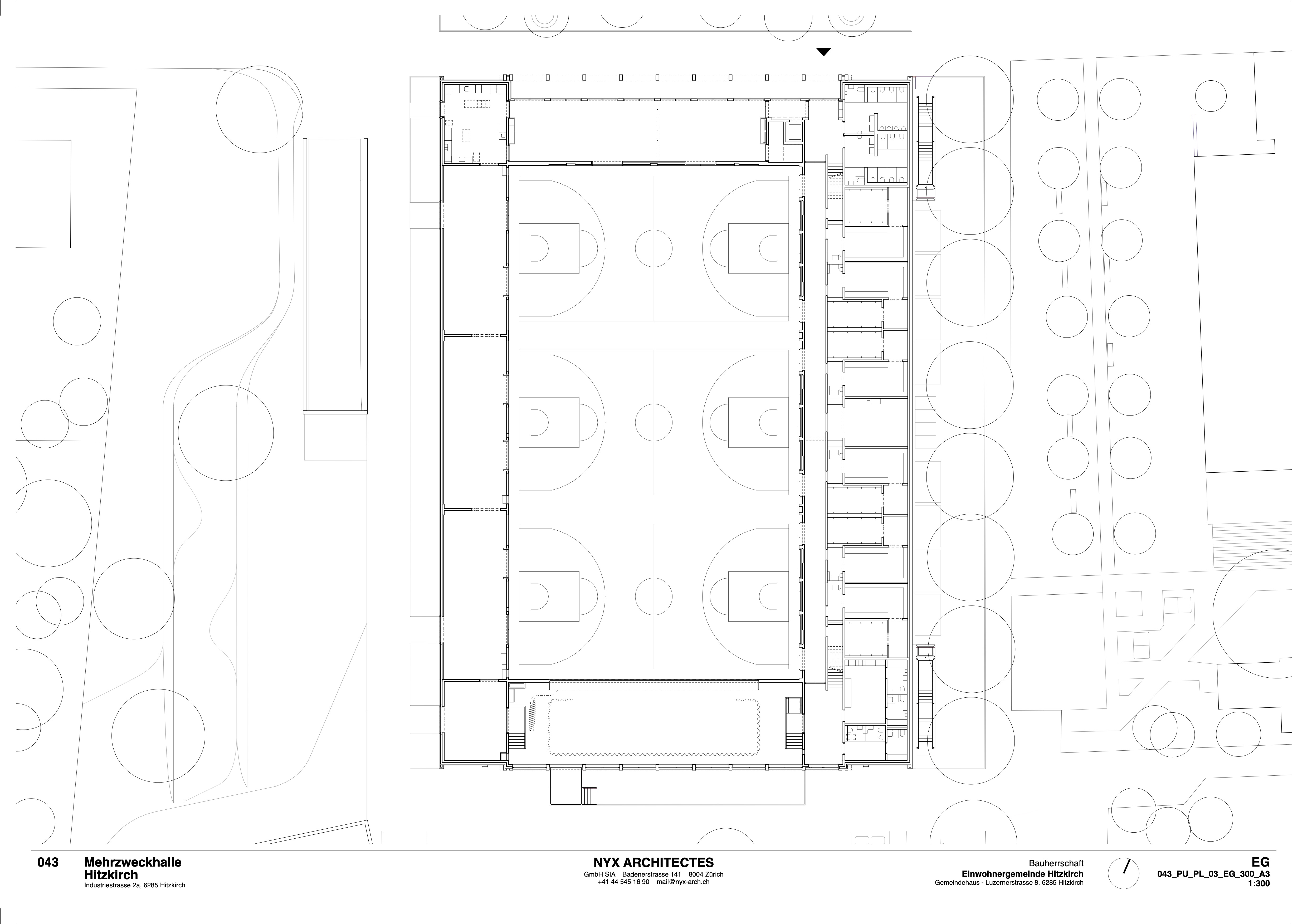 Der Neubau der Dreifach- und Mehrzweckhalle ergänzt das historisch gewachsene Schulareal von Hitzkirch. Die Platzierung entlang des Schulwegs stärkt die bestehende Nord-Süd-Achse, integriert die Grossform sensibel in das heterogene Umfeld aus Wohnbauten, Friedhof und Industriearchitektur und schafft klare, durchlässige Aussenräume.