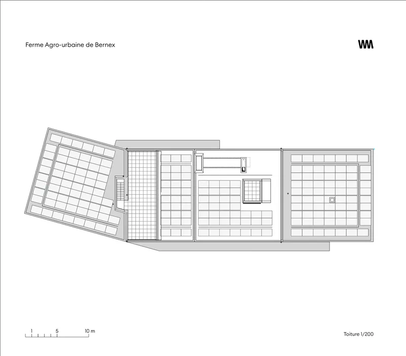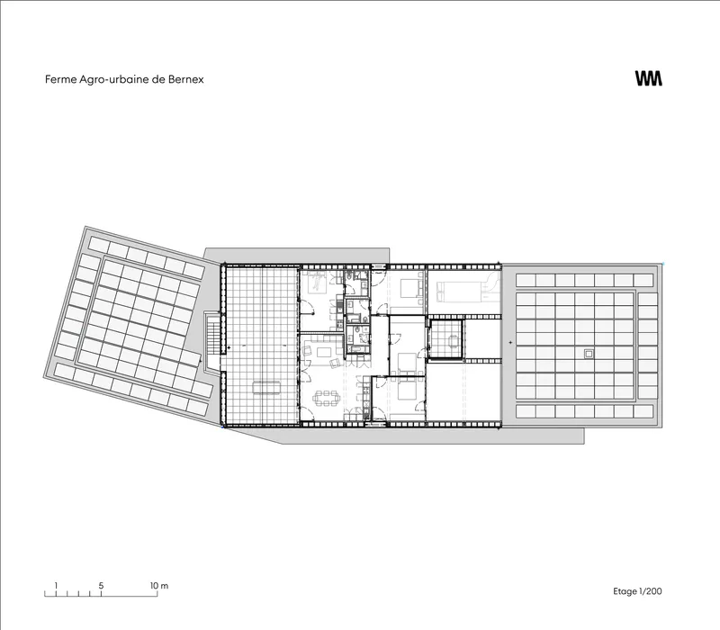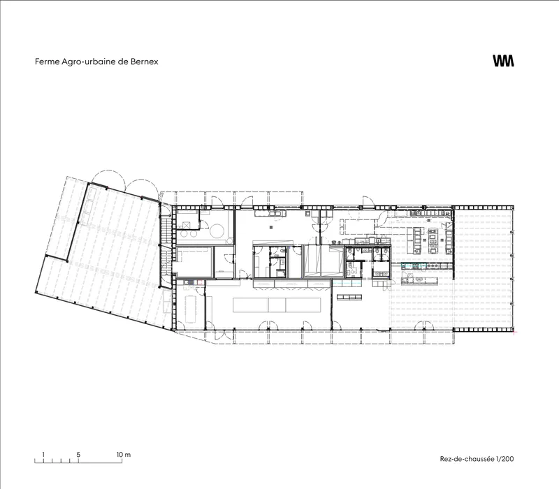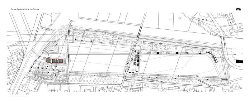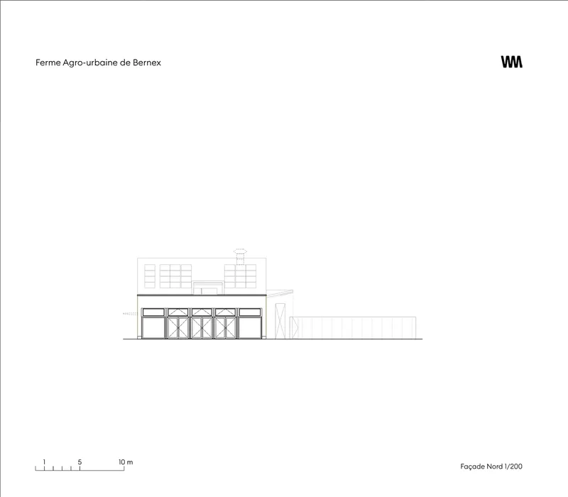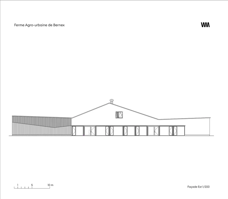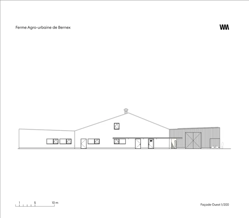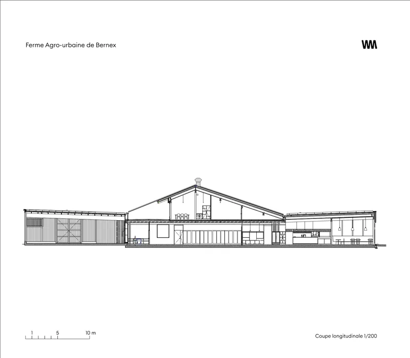 La ferme agro-urbaine constitue le cœur du parc agro-urbain de Bernex. À la fois vitrine des produits locaux et lieu de rencontre et de partage, elle réunit des espaces de production agricole, un marché, un lieu de restauration ainsi que des logements. Le programme comprend notamment une cuisine professionnelle, associée à des surfaces commerciales, un hangar pour les machines agricoles, un appartement et un studio de fonction, tous deux largement ouverts sur le paysage nourricier environnant. La ferme s’affirme ainsi comme un marqueur architectural et social, à l’interface entre production maraichère, pédagogie et lien avec le territoire.
