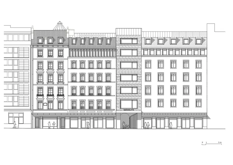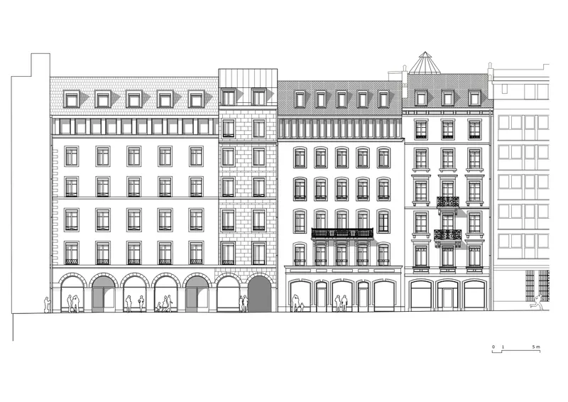 Les immeubles 5–7–9, fortement transformés dans les années 1970, bénéficient d’une requalification de leur enveloppe : les ajouts récents sont supprimés, une expression minérale contemporaine est restituée et la hiérarchie des niveaux – socle, corps principal, attique – est clarifiée en cohérence avec le contexte genevois. Le passage public du n°7 est redessiné, renforçant la continuité visuelle et fonctionnelle entre la rue et le fleuve.