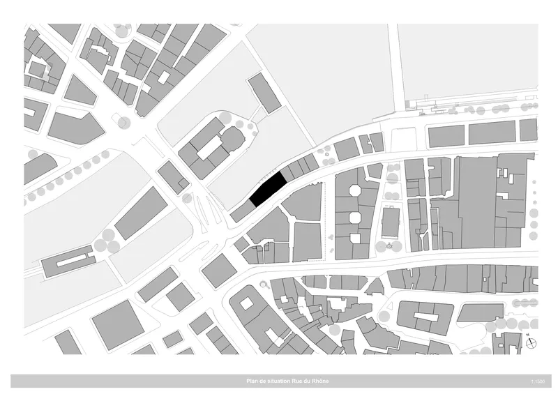Situé dans les Rues-Basses de Genève, l’ensemble des immeubles Rue du Rhône 3–5–7–9 occupe une position urbaine exceptionnelle le long du Rhône, au sein du seul îlot historique non interrompu par une voirie. Inscrit dans le périmètre sensible du plan de site de la rade, le projet s’inscrit dans un contexte patrimonial riche, marqué par la stratification des époques, des usages et des formes bâties.