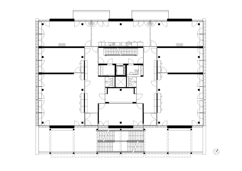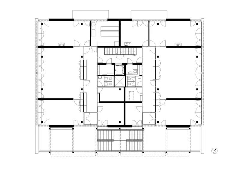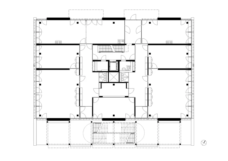 Der standardisierte Grundriss mit gängigen Spannweiten, konventionellen Fluchtweglängen und einer durchgehenden Raumhöhe ist nutzungsoTen und systemgetrennt. Das primäre Stützen- Plattentragwerk ist hinsichtlich seines CO2-Abdrucks optimiert. Die Ausfachung mit Holzständerwände erlaubt eine zukünftige Flexibilität und eine Reduktion des CO2-Abdrucks.