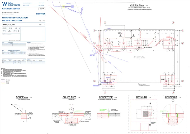 Initialement composée d’un bâtiment de plain-pied, l’ancienne caserne a été transformée en un ouvrage sur deux niveaux. Cette évolution repose sur la conservation des fondations existantes, complétées afin de permettre la surélévation. Ce choix limite les interventions lourdes, réduit l’impact environnemental lié aux travaux de fondation et valorise le bâti existant, tout en garantissant l’adéquation structurelle de l’ouvrage à son nouveau gabarit.