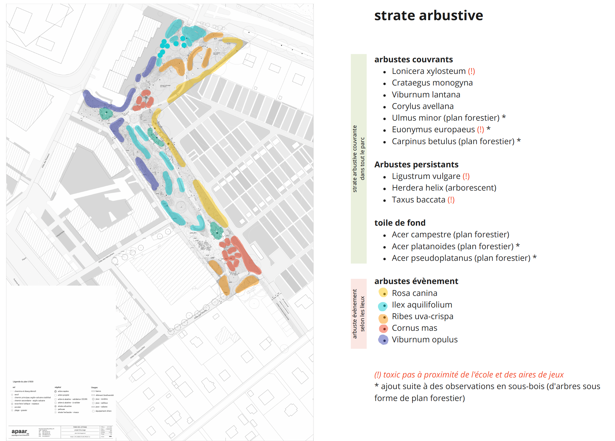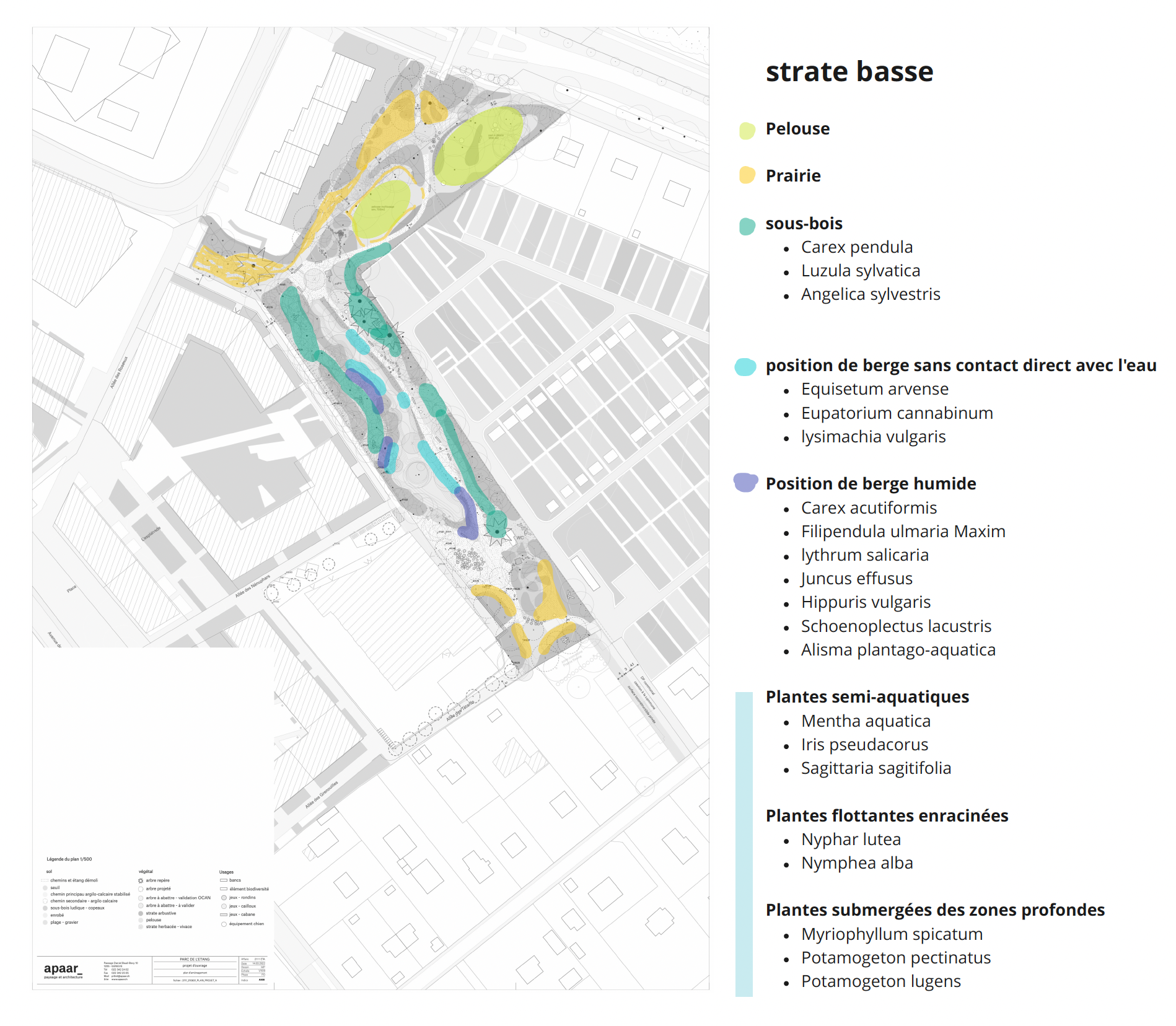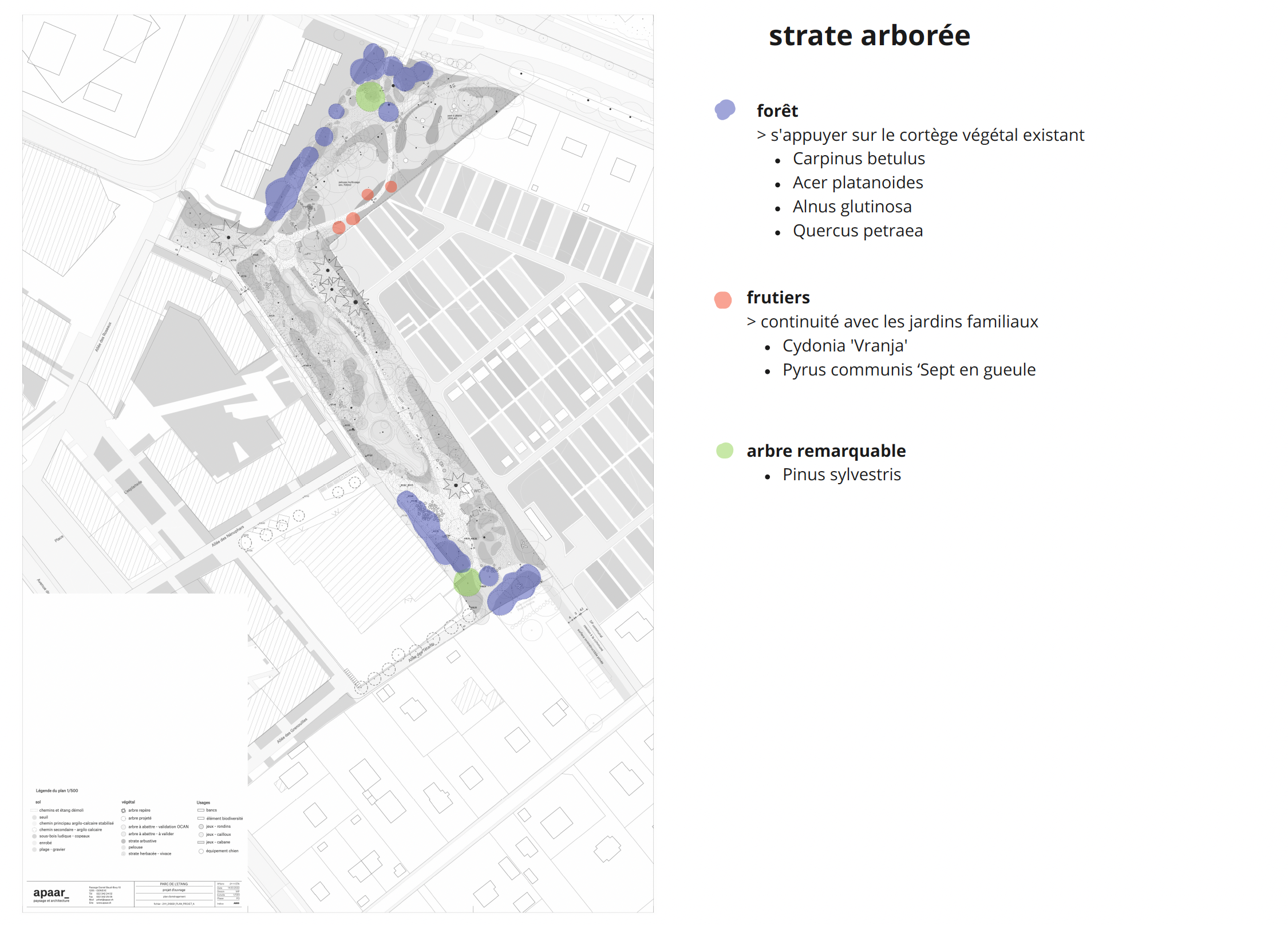 Situé au cœur urbain, le parc devient une pièce structurante du quartier de l’Étang et un maillon du parc linéaire de Vernier vers le futur parc des Écoles. Le projet s’ancre dans les paysages et dynamiques genevoises (écotone, cycles de l’eau) en conciliant densité urbaine et continuités naturelles.