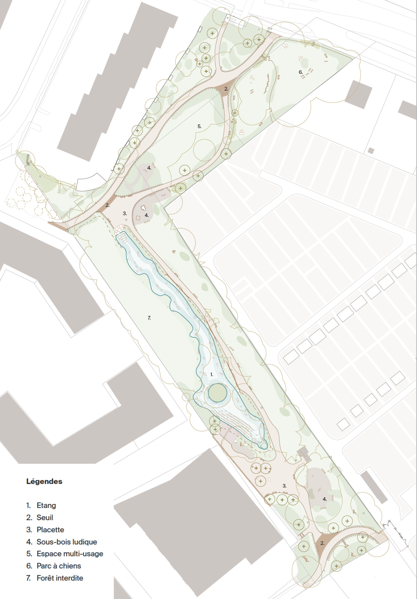 Le parc combine fonctions hydrauliques et sociales : l’étang de rétention gère les eaux pluviales, tandis que les cheminements restructurés absorbent la hausse de fréquentation. La promenade offre traversées, pauses et boucles de parcours, en articulant clairières, lisières, sous-bois et berges, avec des accès clairs et continus.