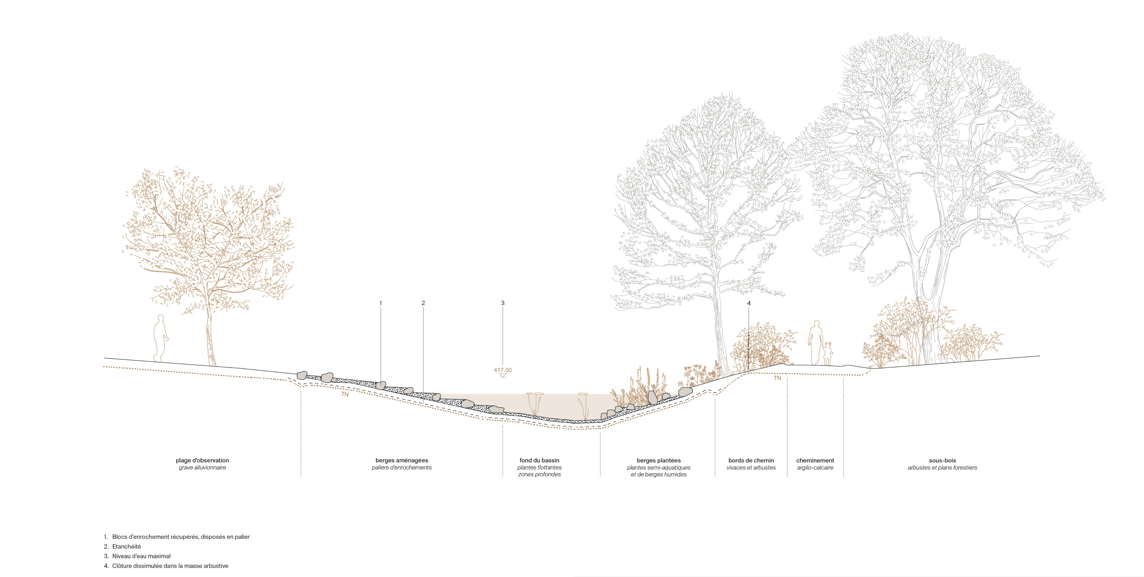 La beauté émerge de la justesse des transitions : clairières et sous-bois, lumière filtrée, lignes de promenade, présence de l’eau. Le projet met en scène des processus naturels plutôt que des objets : variations saisonnières, berges vivantes, végétation en évolution. Une esthétique sobre, immersive et durable, au service du quotidien.