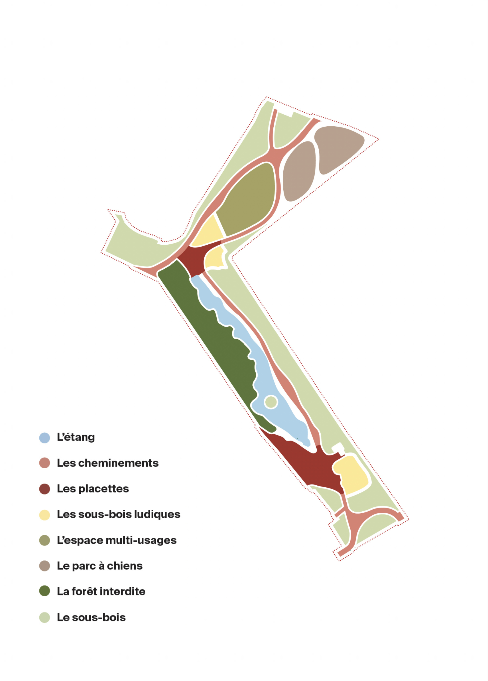 La forêt urbaine conserve son caractère singulier : un lieu de retrait, d’ombre et de calme, rare dans un tissu neuf. Le projet renforce la dimension sensible de l’eau et des seuils (lisière/clairière/berge), faisant du parc un espace de ressourcement et de déconnexion. La temporalité du vivant (saisons, croissance) fonde l’identité.