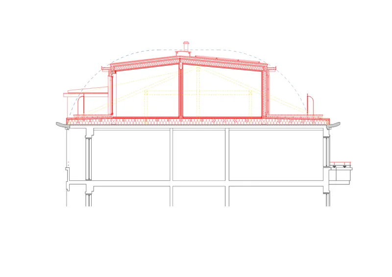 L’intervention s’inscrit dans une continuité de l’existant. Un volume en bois remplace la toiture et conserve la composition symétrique en s’implantant en partie centrale. La couture est traitée par l’élargissement de la corniche qui trouve une nouvelle hiérarchie dans la façade. Le langage architectural est décliné en réinterprétant les denticules en simili-pierre avec les chevrons de l’avant-toit.