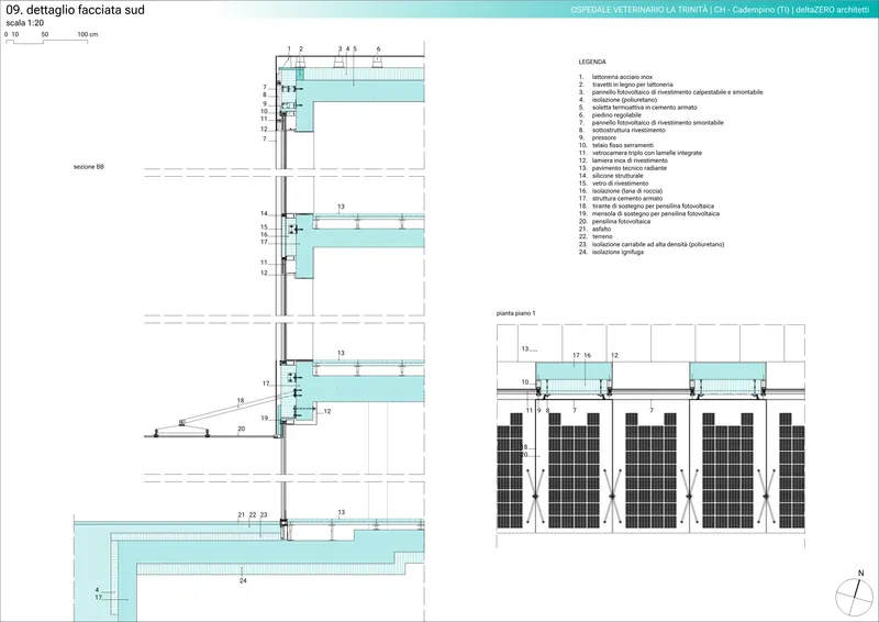 Per assicurare il fabbisogno energetico dell’edificio (esclusi gli apparecchi tecnici destinati alle attività ospedaliere), è stato necessario rivestire con una centrale PV il tetto, le facciate sud, est, ovest, la pensilina frangisole a sud e la terrazza.