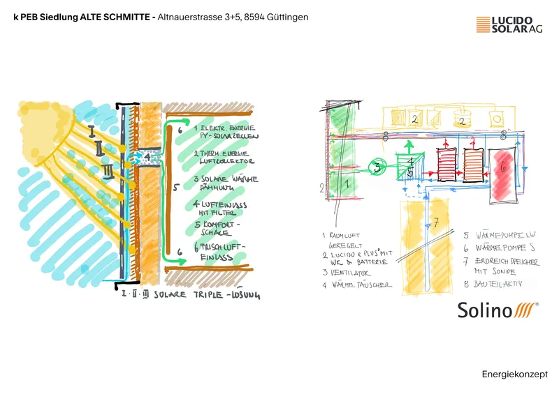 Die Überbauung basiert auf einer konsequenten Holzbauweise im Minergie-P-Standard. Thermoaktive Solar­fassaden, Photovoltaik auf Dach und Fassade, Erdsonden-Wärmepumpen und ein Batteriespeichersystem ermöglichen eine jährliche Energieproduktion von über 400 % des Eigenbedarfs. Die Siedlung ist CO₂-frei im Betrieb und langfristig klimapositiv ausgelegt.