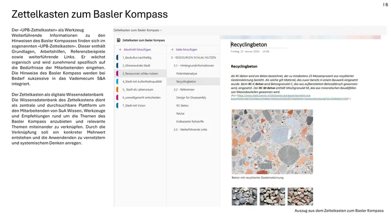 Die sieben Themenfelder – von Baukultur, klimaneutrales Bauen und Ressourcennutzung über Aufenthaltsqualität, Lebensraum und umweltgerechte Entscheidungen bis zur Vision und Innovation – fördern interdisziplinäre Abwägungen, Lernprozesse und eine langfristig kosteneffiziente Transformation der gebauten Umwelt. Als ergänzendes Werkzeug stellt der digitale UPB-Zettelkasten Grundlagen, Arbeitshilfen, Beispiele und Links bereit und unterstützt vernetztes, systemisches Denken. Damit leistet der Basler Kompass einen substanziellen Beitrag zur zeitgenössischen Baukultur und zur nachhaltigen Entwicklung urbaner Lebensräume.