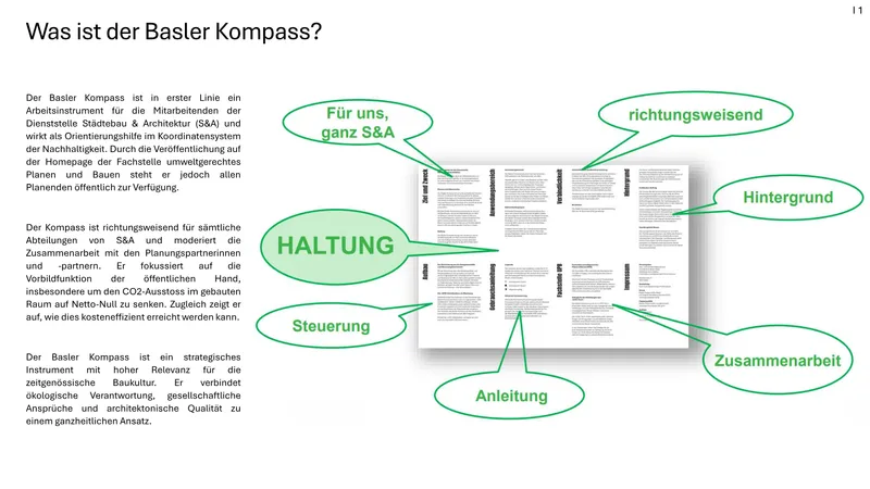 Der Basler Kompass ist ein praxisorientiertes Steuerungs- und Arbeitsinstrument des Kantons Basel-Stadt für das Planen, Bauen und Weiterentwickeln des gebauten Lebensraums. Primär für die Mitarbeitenden der Dienststelle Städtebau & Architektur (S&A) entwickelt, ist er online auch für externe Planende zugänglich und wirkt als Orientierungshilfe im Koordinatensystem der Nachhaltigkeit. Er moderiert die Zusammenarbeit zwischen Verwaltung und Planungspartner:innen, stärkt die Vorbildfunktion der öffentlichen Hand und unterstützt die konsequente Ausrichtung auf das kantonale Netto-Null-Ziel 2037 im Gebäudesektor.