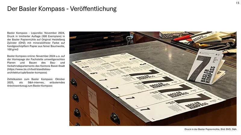 Der Basler Kompass wurde in limitierter Auflage in der Basler Papiermühle auf handgeschöpftem Papier gedruckt: Damit wird die Wertigkeit des Inhalts auch haptisch erlebbar gemacht.