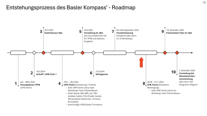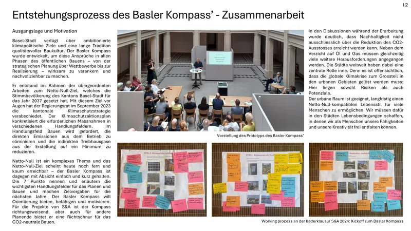 Entwicklung des Basler Kompass’ als partizipativer Prozess: Eine interdisziplinäre Arbeitsgruppe aus 7 Abteilungen (Raumplanung, Stadtraum, Städtebau, Hochbau, Gebäudemanagement und Denkmalpflege sowie die Fachstelle umweltgerechtes Planen und Bauen) entwickelte in einem Jahr den Basler Kompass. Dadurch wurde eine gute Durchgängigkeit über verschiedene Massstabsebenen (Planen und Bauen) gewährleistet.