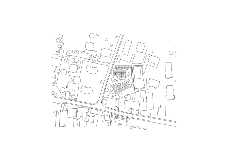 Dans un contexte périurbain marqué par l’apparition d’immeubles anonymes et déconnectés de l’esprit du lieu, le projet cherche, par son expression architecturale, son échelle et le choix des matériaux de façade, à s’ancrer dans le site et à renforcer le caractère villageois existant. L'implantation du nouveau bâtiment et ses aménagements s'adaptent, s'appuient et tirent profit d'une magnifique végétation, mature, puisque plantée il y a plus de 40 ans.