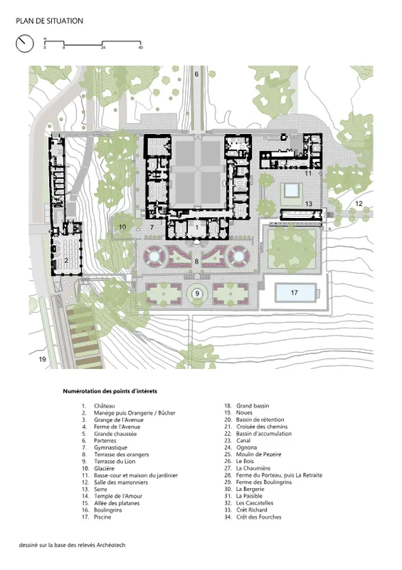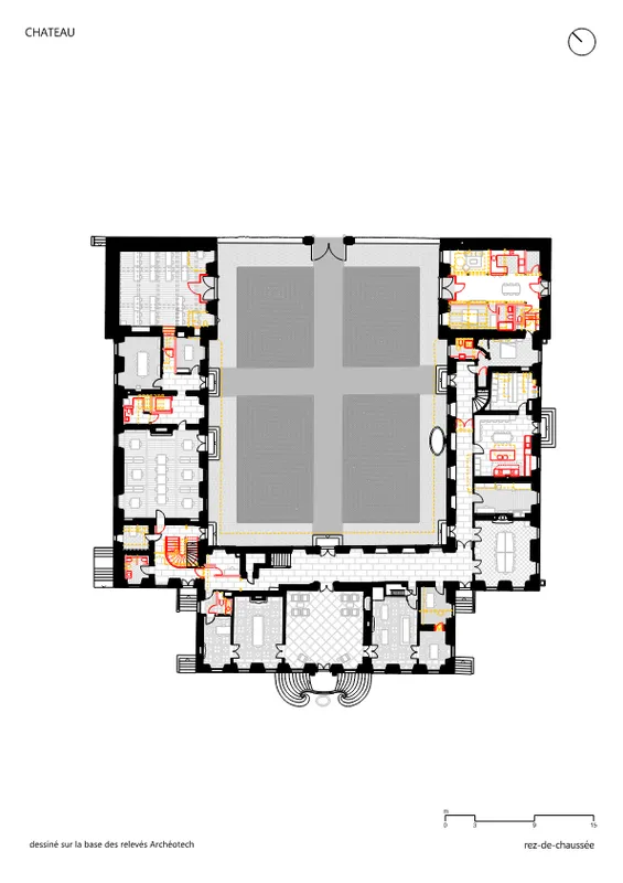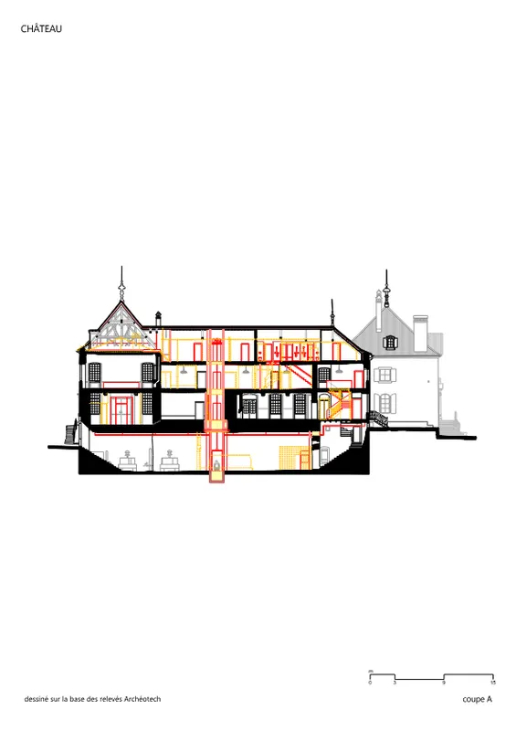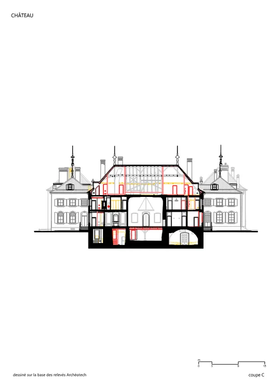 Le château du 18e siècle a pu être adapté, avec grand respect de la substance historique, au nouveau programme de campus. Certains salons sont devenus salles de cours, les nombreuses chambres sont devenues hébergement pour les étudiants, des sanitaires regroupés ont permis de minimiser les interventions techniques. Le manège-orangerie et le bûcher peuvent accueillir dans les structures existantes -de manière contemporaine- un grand réfectoire, les cuisines ainsi que des chambres individuelles.