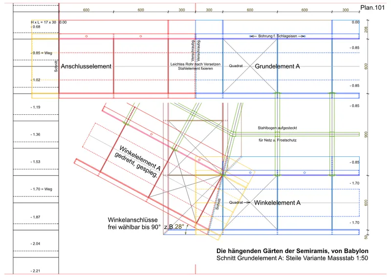 Als Versuchsanlage ist eine kleinmassstäbliche Stahlkonstruktion mit einem minimalen Fundament als Gehweg entstanden (Fotos). Die Ausführung ist aufwendig, die Anlage zu eng und die Hochbeete sind zu niedrig. Für das entsprechende Projekt im grösseren Massstab sind folgende Zielsetzungen festgelegt worden: