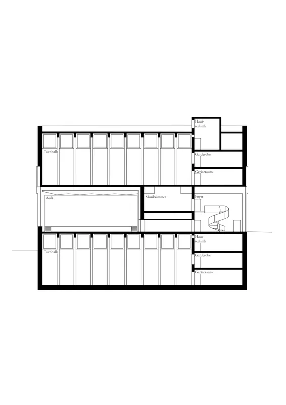 Der typostrukturelle Ansatz übersetzt dissonante Vorgaben in ein robustes, breit akzeptiertes und ästhetisch hochwertiges Projekt. Wechselnde pädagogische Anforderungen, die gleichzeitige Nutzung von Turnhallen und Konzertsaal sowie ein vorwiegend materialbezogenes Nachhaltigkeitsverständnis werden durch eine langlebige, flexible Struktur beantwortet – eine Plattform für vielfältige Nutzungen, die dank ihrer langen Lebensdauer den CO₂-Fussabdruck positiv beeinflusst.