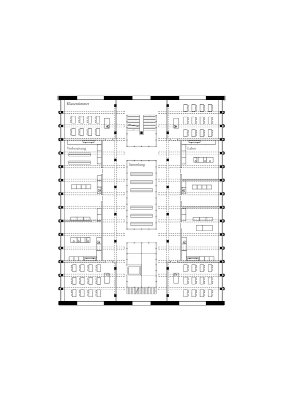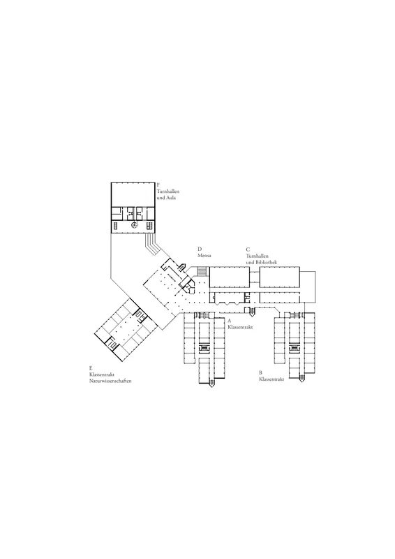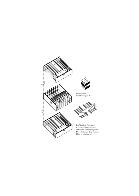 Innenräumlich definiert der typostrukturelle Ansatz die Organisation: Im Naturwissenschaftstrakt ordnet eine Rippendecke Tragwerk und Haustechnik und ermöglicht flexible Grundrisse. Die um 90° gedrehte Anordnung der Struktur im Hallentrakt ermöglicht eine kompakte Schichtung, die sich auch im architektonischen Ausdruck widerspiegelt. Die Aula bildet als hölzerner, akustisch autonomer Raum einen zur Öffentlichkeit offenen Ort.