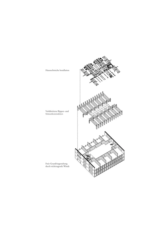 Die Wirtschaftlichkeit ergibt sich aus konstruktiver Klarheit: hoher Wiederholungsgrad, Vorfertigung im Naturwissenschaftstrakt, einfache Fügung und langlebige Materialien senken Bau- und Unterhaltskosten. Die Verdichtung auf bestehendem Boden maximiert Standort- und Infrastrukturleistung. Die städtebauliche Adressbildung an der Limmattalbahn steigert Nutzungsauslastung und öffnet das Areal für schulische und öffentliche Programme über den Tagesbetrieb hinaus.