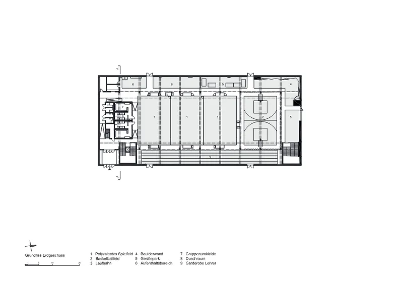 Der Umbau basiert auf der Weiterverwendung des Bestands. Neue Einbauten verstehen sich als additive Zutaten, ohne anzudocken. So wurde auch die zweigeschossige Garderobenbox in Holz-Leichtbauweise wie ein „Haus im Haus” in die Halle eingestellt. Die Holzbauelemente, aufliegende Sportböden und textile Raumtrenner ermöglichen einen späteren Rückbau, ohne Eingriffe in die Tragstruktur vornehmen zu müssen. Dadurch wird der Materialeinsatz minimiert und die Substanz des Bestands langfristig genutzt.