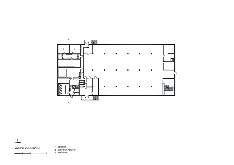 Illiz architektur wandelte die ehemalige Messehalle mit einfachen, kostengünstigen Mitteln in eine multifunktionale Sportstätte um. Im Sinne eines möglichst breiten und vielfältigen Angebots wurden drei Spielfelder für Ballsportarten, ein Polysportbereich, eine 50m-Laufbahn und eine Boulderwand integriert. Durch die Nutzung von Vorhängen und Trennnetzen konnte der einprägsame Charakter der Halle und die Grosszügigkeit des Tragwerks erhalten bleiben. Alle notwendigen Einbauten verstehen sich als additive Zutaten, die sich vom Bestand klar abheben. So wurde auch die zweigeschossige Garderobenbox in Holz-Leichtbauweise wie ein als „Haus im Haus” in die Halle eingestellt.
