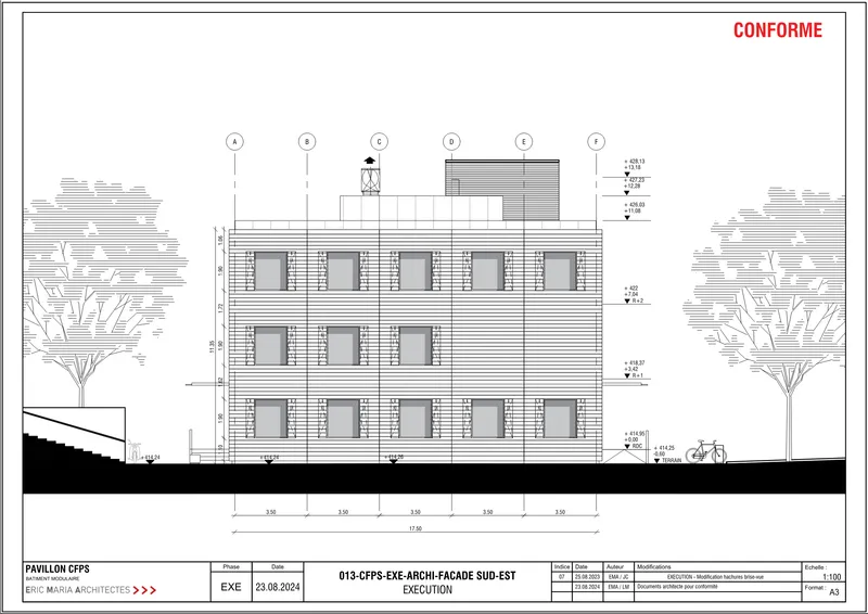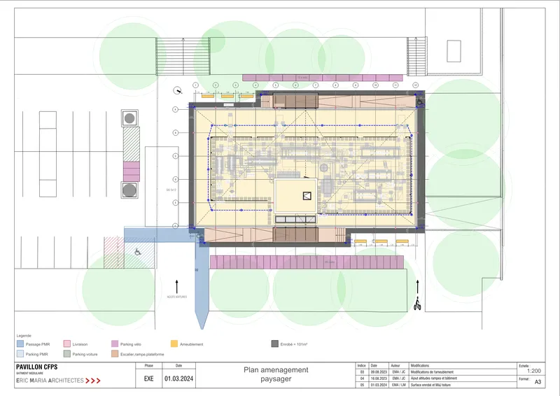 Le pavillon, composé de 3 niveaux hors sol (R+2) et d’une emprise au sol de 17.8 m x 30.0 m, est conçu dans une démarche durable et inclusive, répondant aux normes énergétiques genevoises et à l’accessibilité HAU/SIA 500. Le pavillon est transformable afin d’être réutilisé dans un autre contexte et posé sur le site avec les fondations les plus succinctes possible, afin de pouvoir impacter le site au minimum. Les arbres du parking ont été conservés et certains transplantés le long du projet afin de contextualiser.