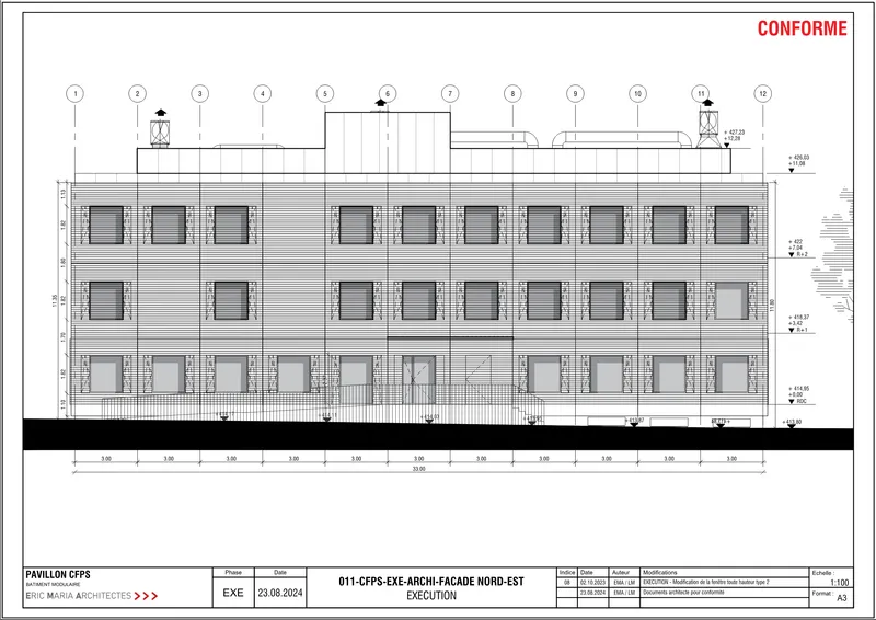 Le projet, dès son programme, a été pensé comme modulaire et modulable par une construction métal/bois reprenant les principes d’une construction par bloc et permettant une réalisation sur 12 mois, dont la construction des charpentes en périodes hivernales.