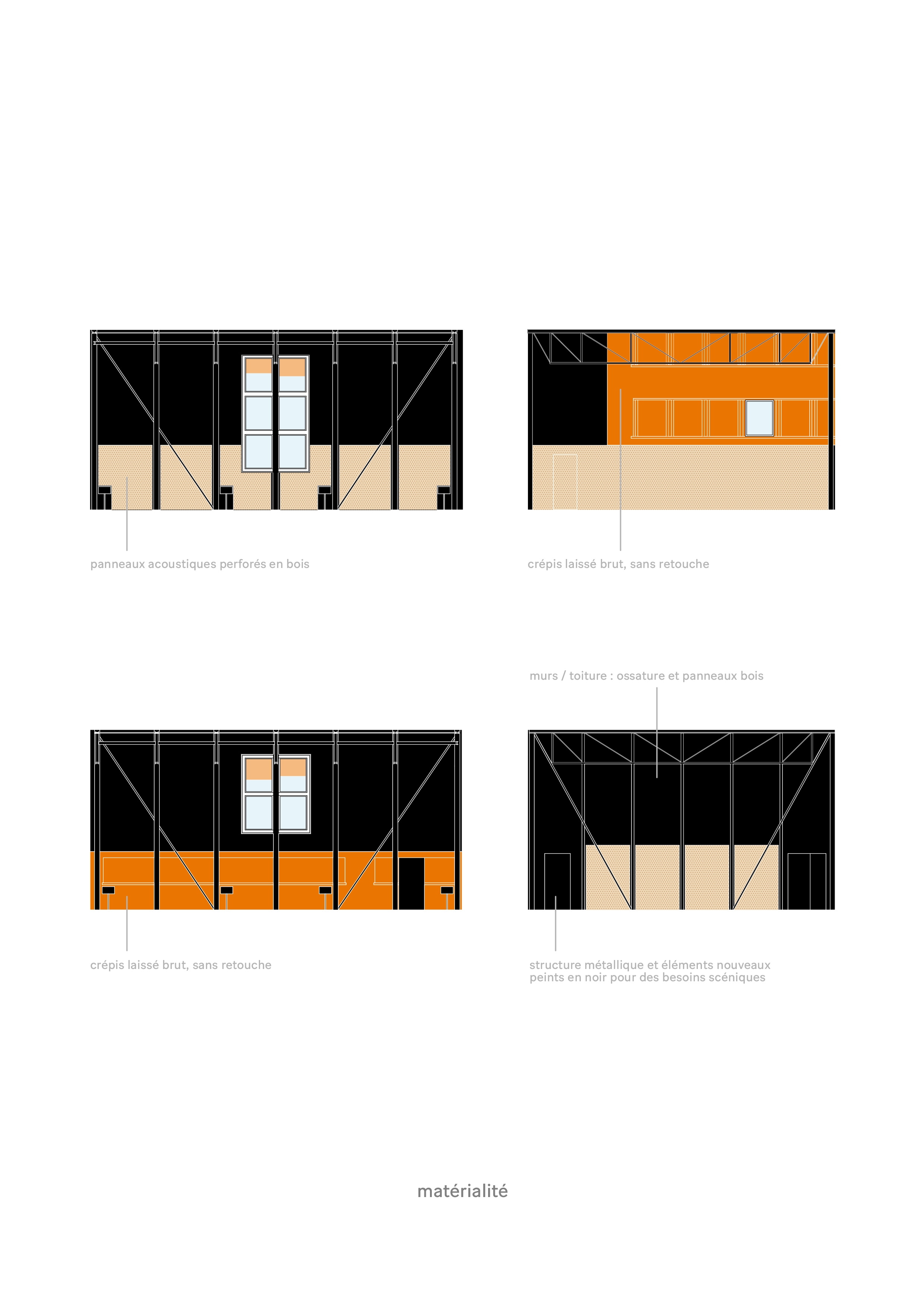 Ce qui doit être habituellement conçu comme une boîte noire – où la neutralité est de mise – est ici imaginé à partir de ce qui existe déjà : deux façades à intégrer, des fenêtres à réemployer in situ, de l’enrobé dégrappé du parking, une teinte orange identitaire.