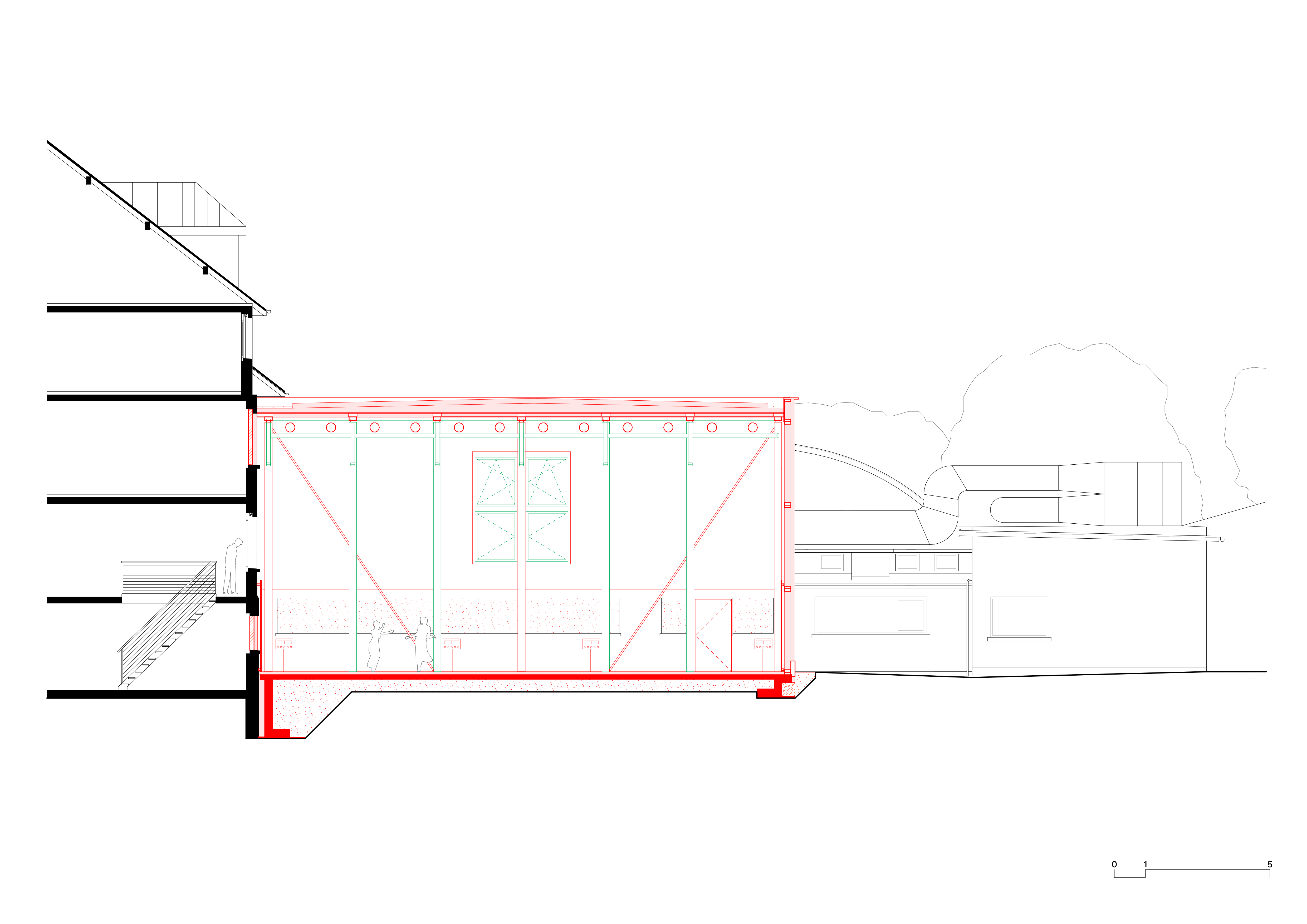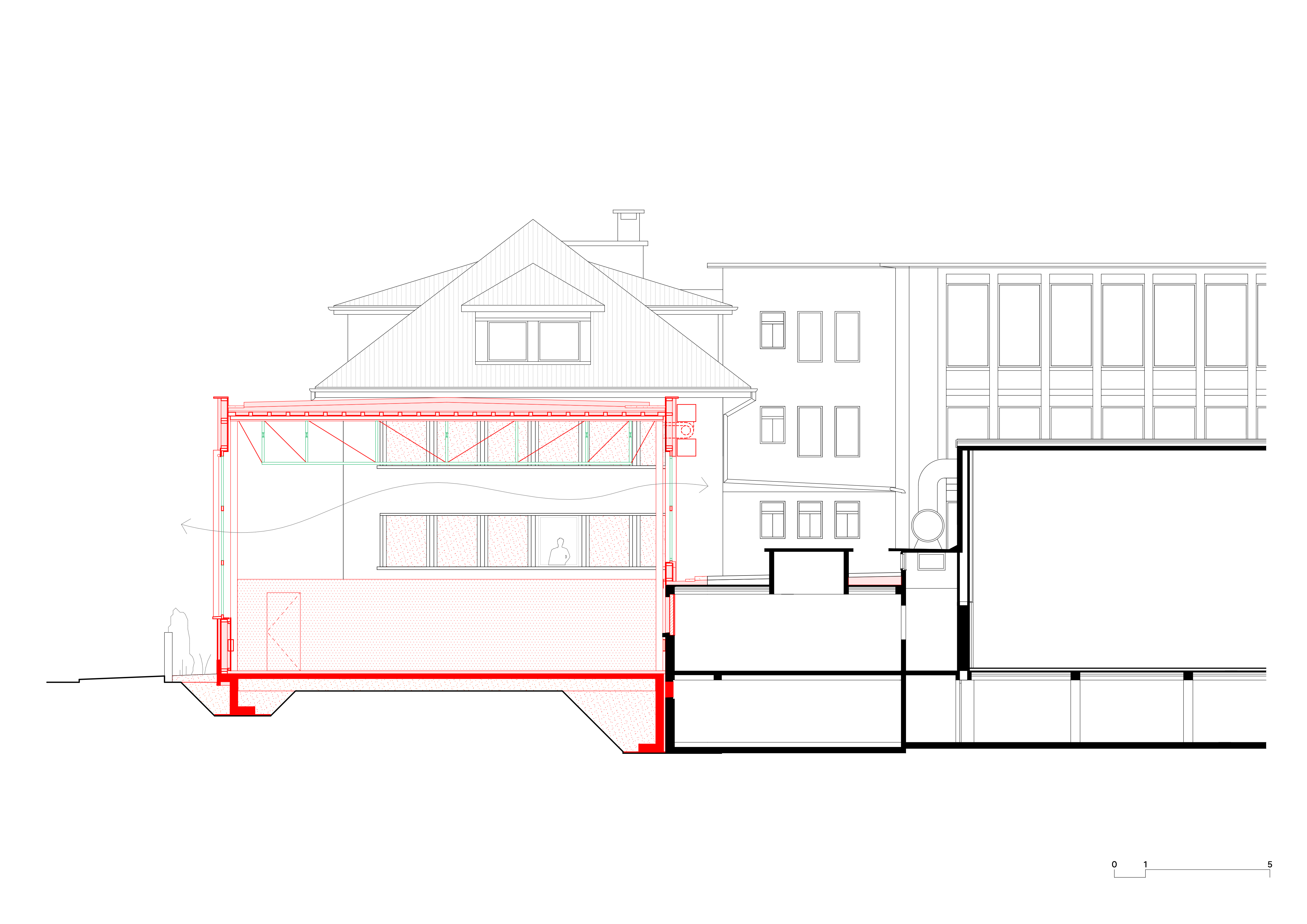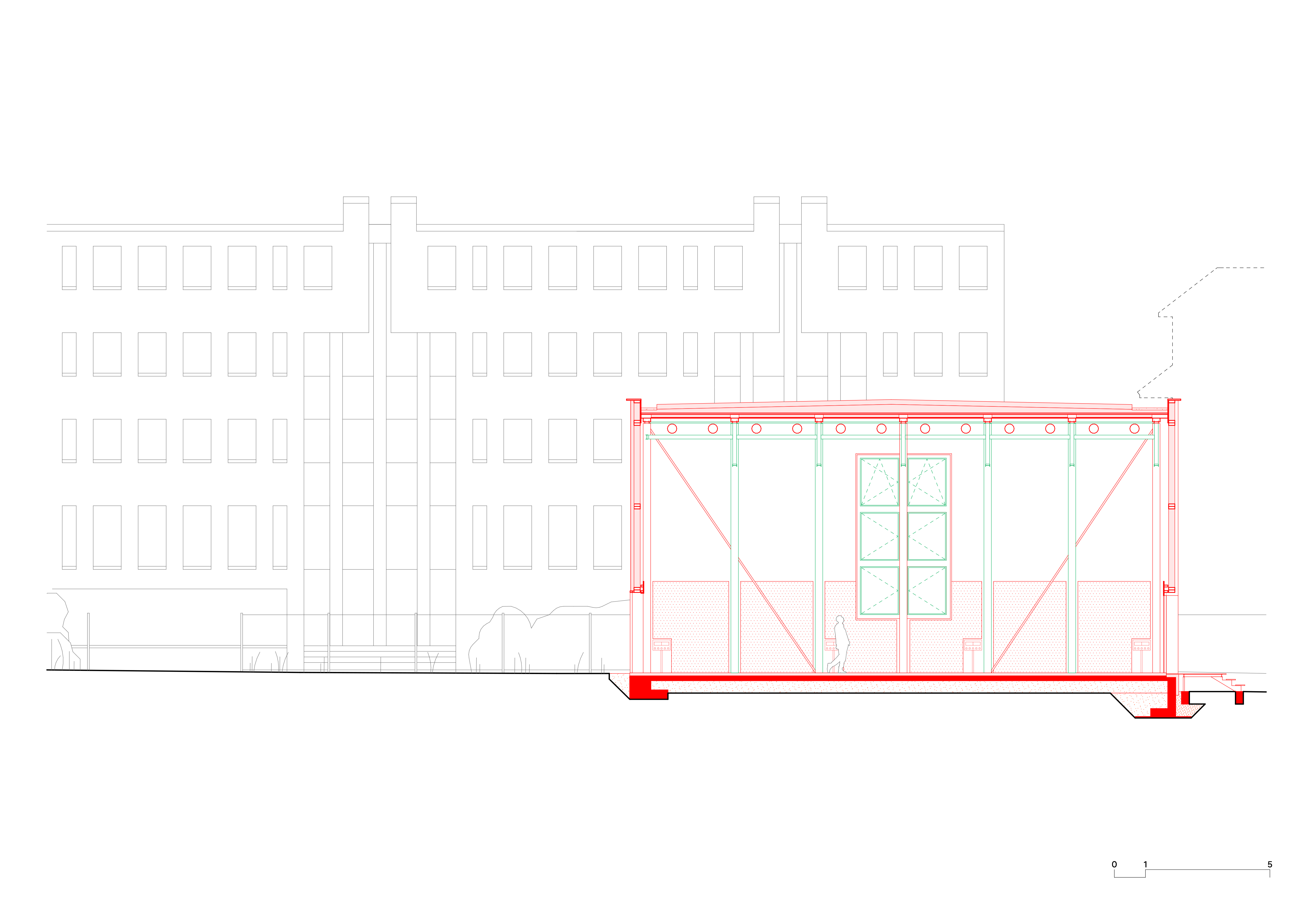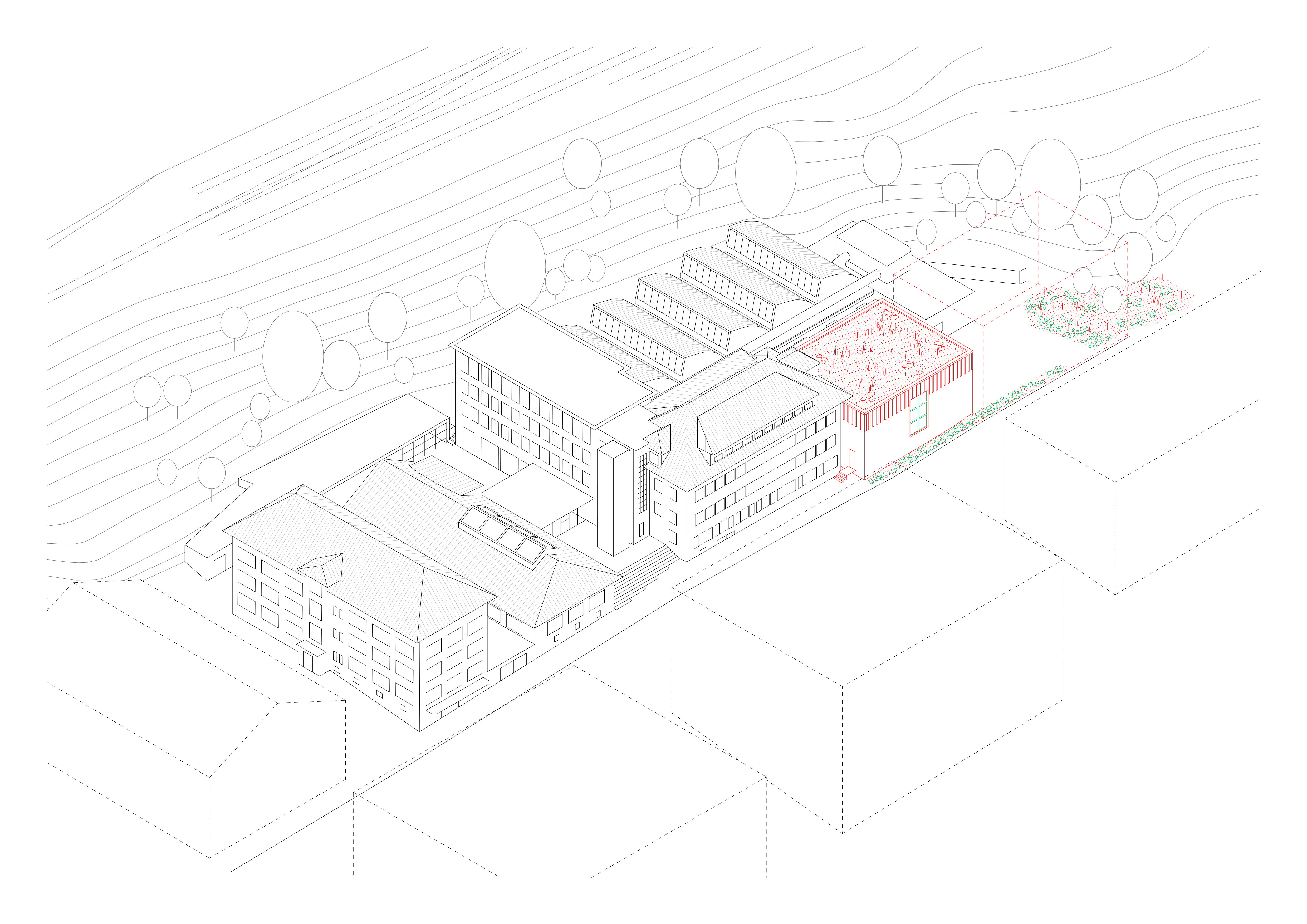 Perçu comme un fond d’impasse, l’extension amorce un renouveau du site puisqu’elle s’inscrit dans un nouveau plan d’affectation, ouvrant la voie à une mutation plus profonde. Par la suite, elle permettra l’accolement d’une autre salle contiguë afin de prolonger l’école.
