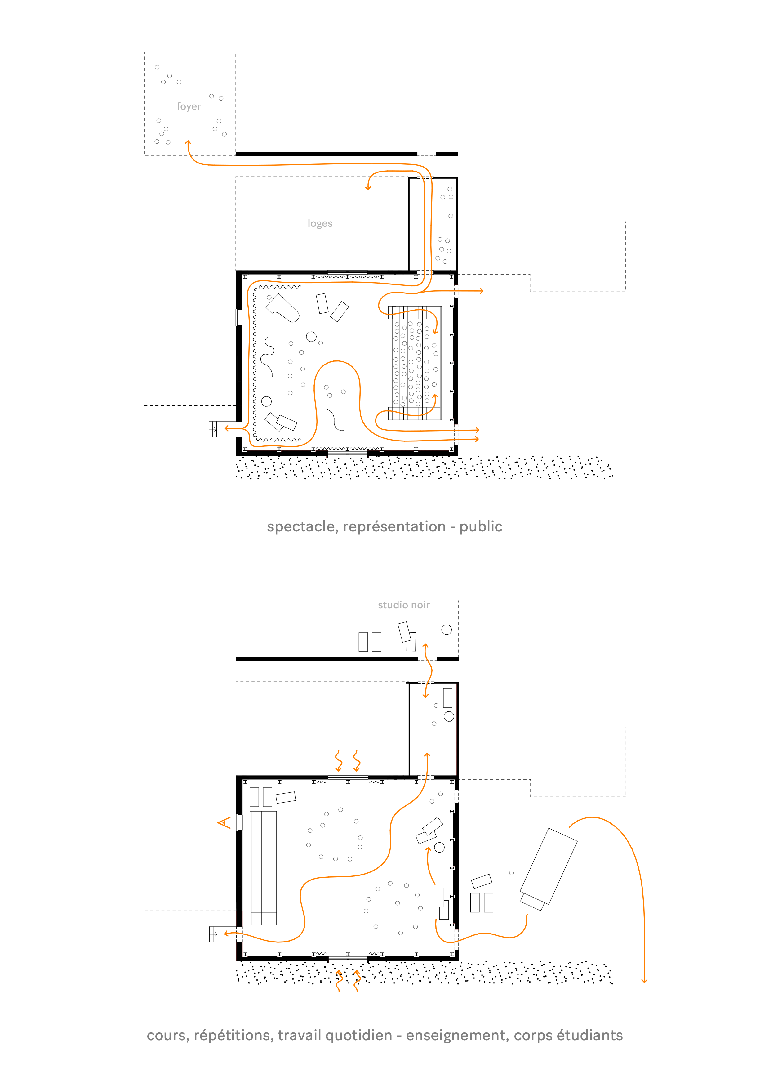 L’école fourmille d’acteurs, danseurs, créateurs scéniques et techniscénistes pour qui l’espace est un outil. L’équipe technique par ses impulsions régulières a su alimenter le projet. Pour réaliser ce bâtiment, nous avons collaboré avec une entreprise générale, engagée éthiquement, qui devait respecter un critère impératif : le réemploi. Lorsque les ressources existantes ont dicté les choix constructifs, c’est par un travail collectif que les solutions architecturales ont émergé.