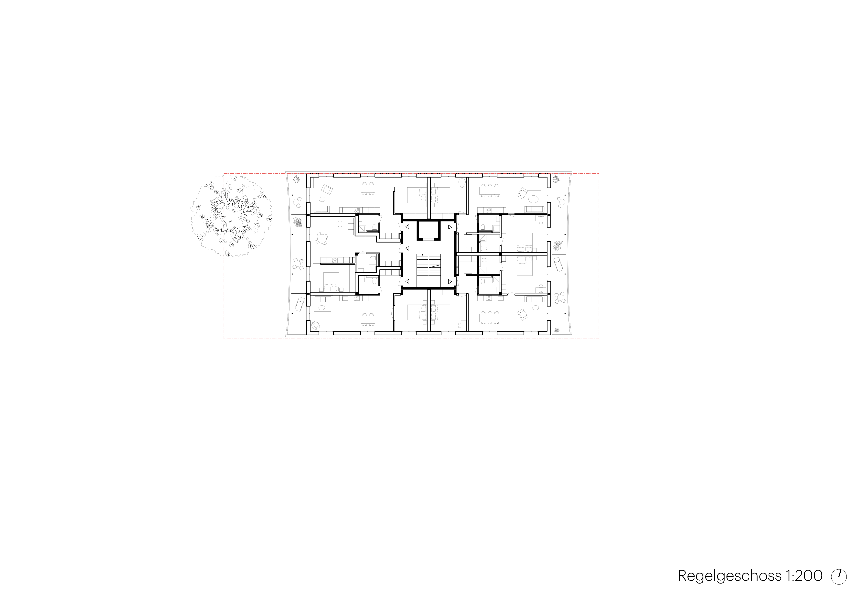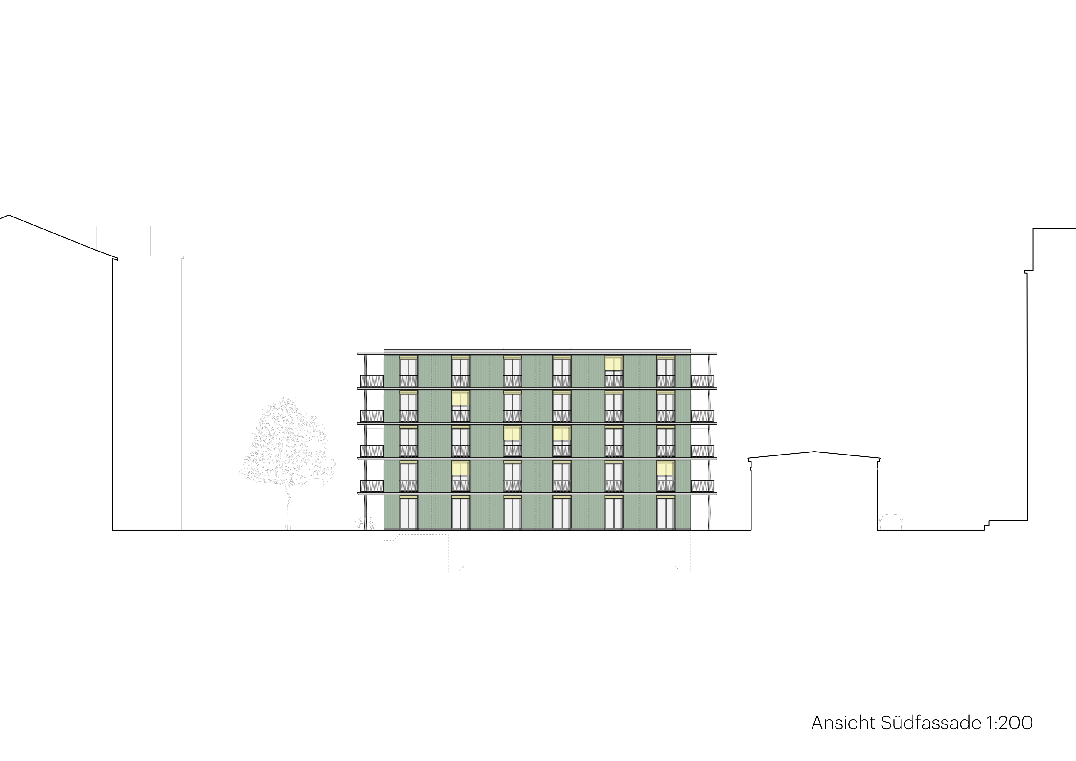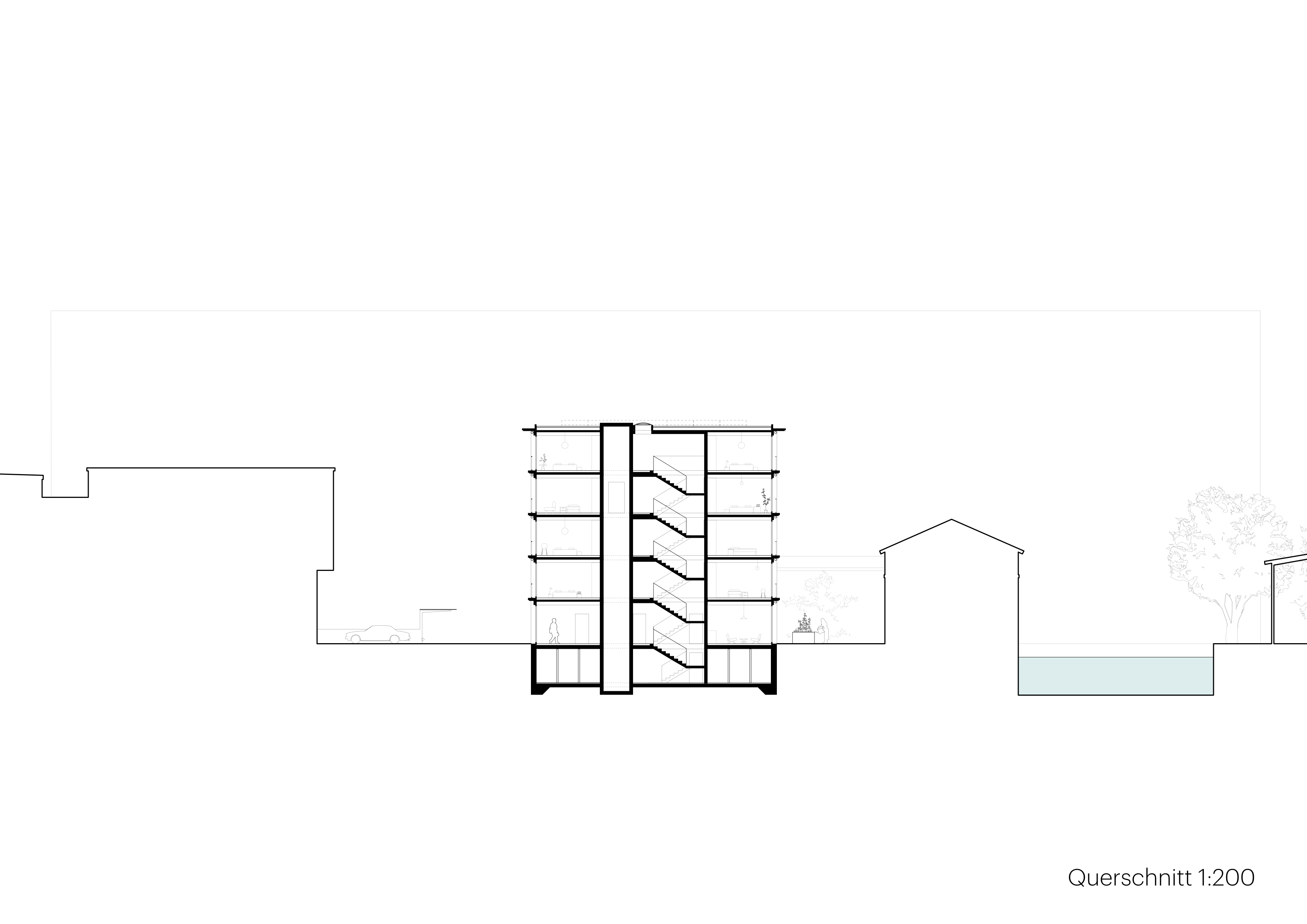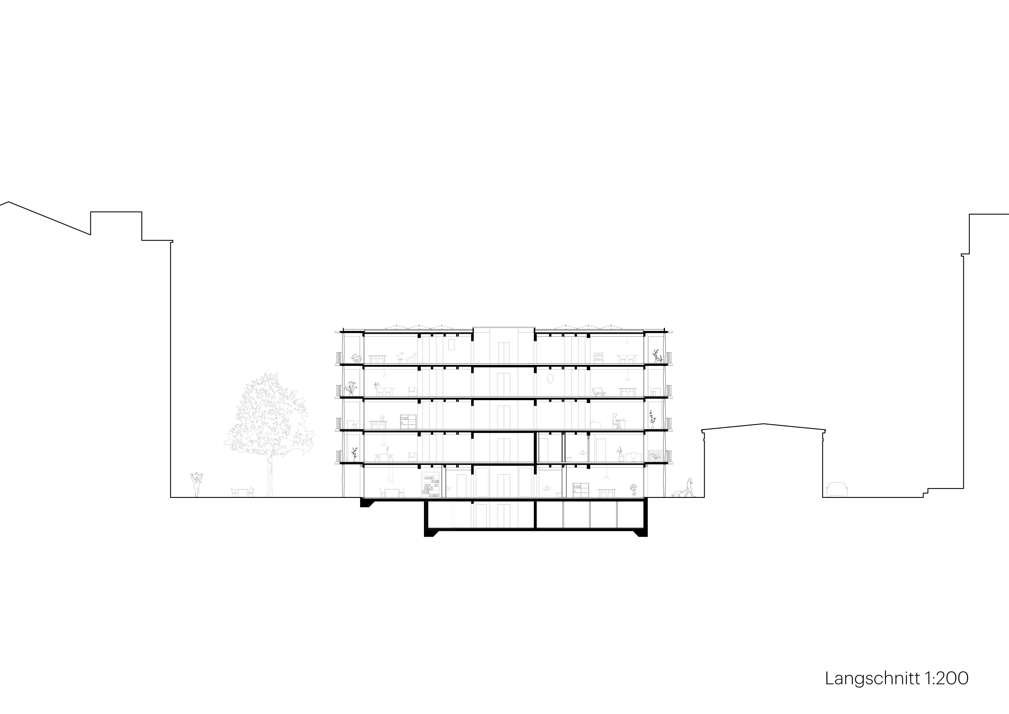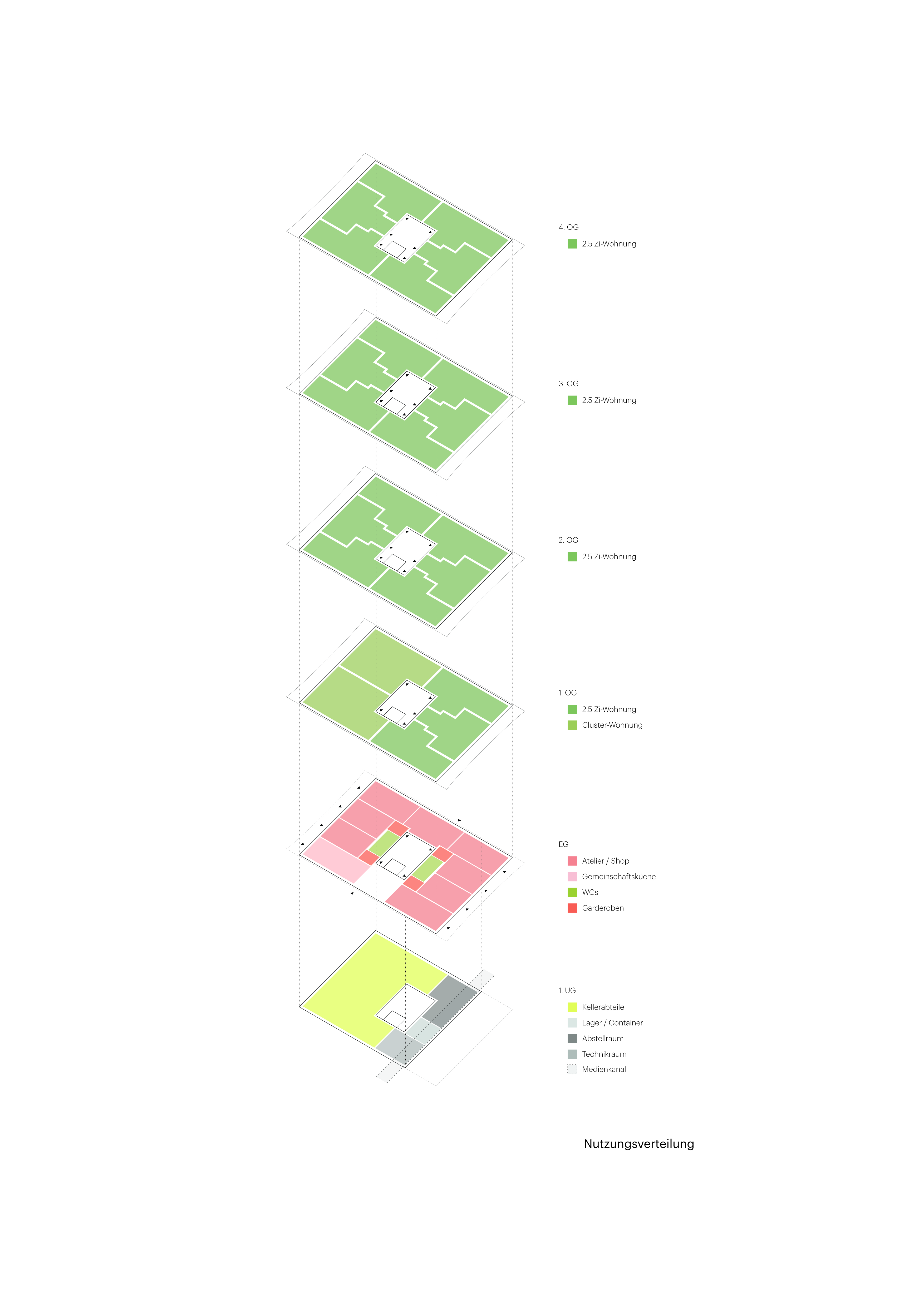 Der kompakte Bau bietet je nach Nutzungsdisposition einen effizienten 4-bzw 6-Bünder um ein zentrales Treppenhaus.Die klare Volumetrie ist Resultat und Garant einer effizienten Wohnorganisation mit hoher Flächeneffizienz und flexibler Grundrissdisposition für unterschiedliche Wohnformen. Das Erdgeschoss bietet Gemeinschafts-und Atelierräume unterschiedlicher Grösse als Ergänzung zu den Wohnflächen.