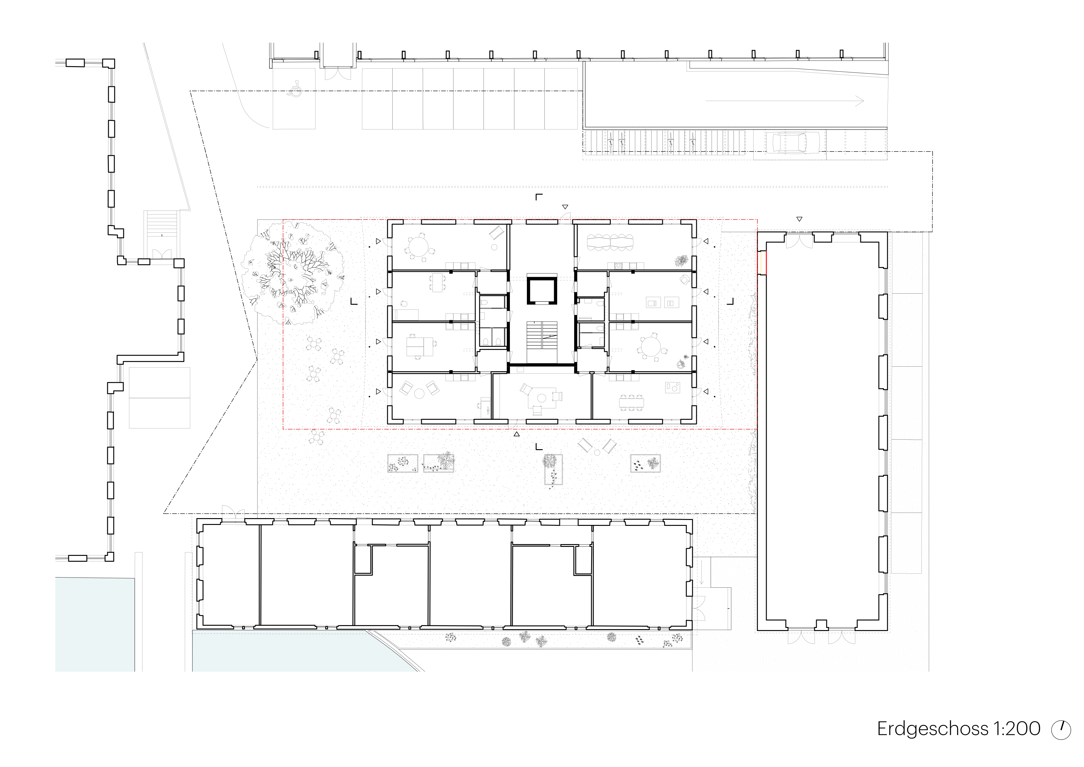 Der weitgehend offene, bewusst nicht programmierte Platz ermöglicht eine flexible soziale und räumliche Aneignung durch die Bewohnerschaft. Versiegelte Flächen im Aussenraum sind auf funktional notwendige Bereiche für Erschliessung und Parkierung beschränkt.Ein durchgängiger Mergelbelag bildet einen klimaangepassten Aussenraum mit hoher Wasserdurchlässigkeit. Die robuste Eiche spendet Schatten, verbessert das Mikroklima und bietet Orientierung.