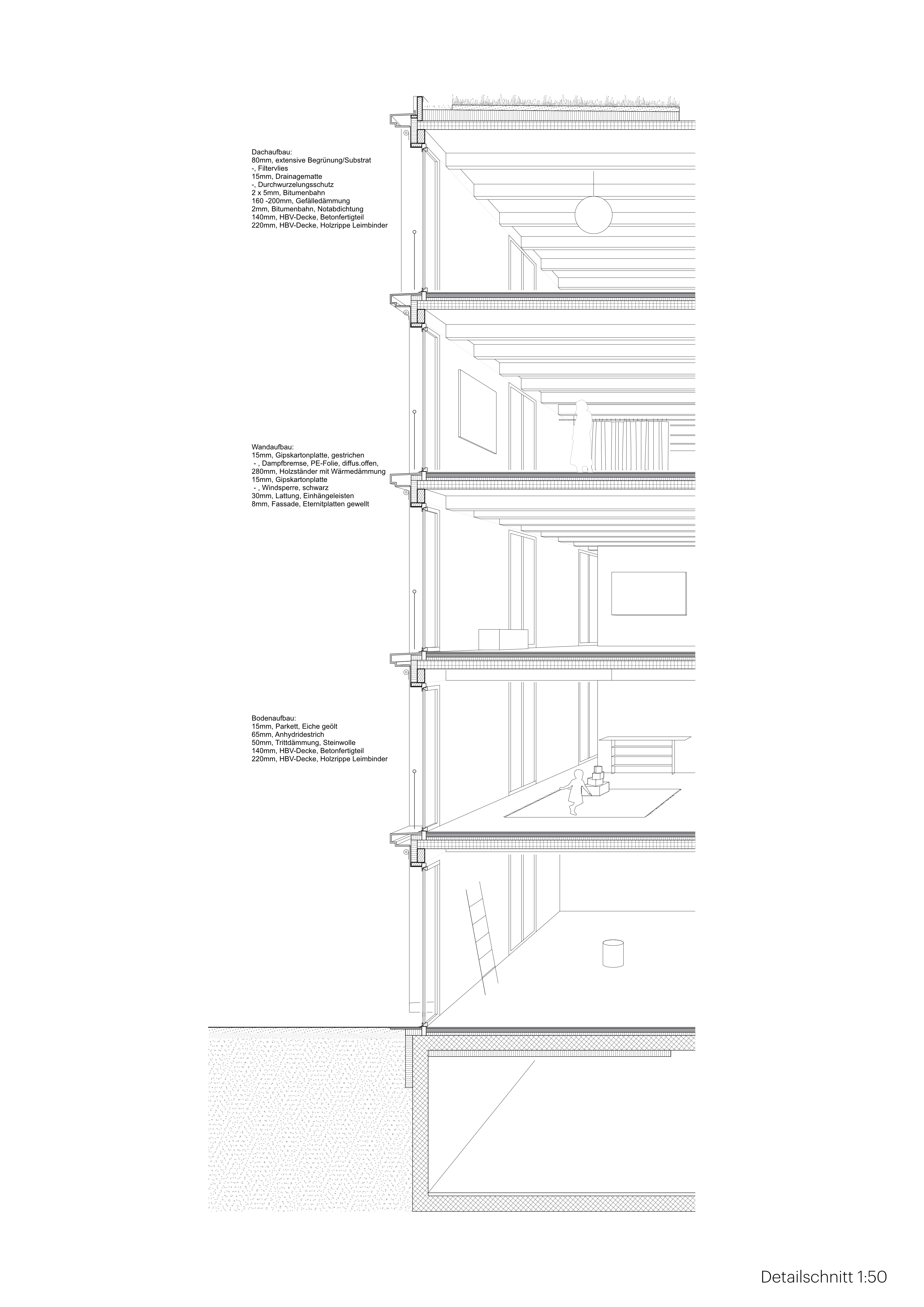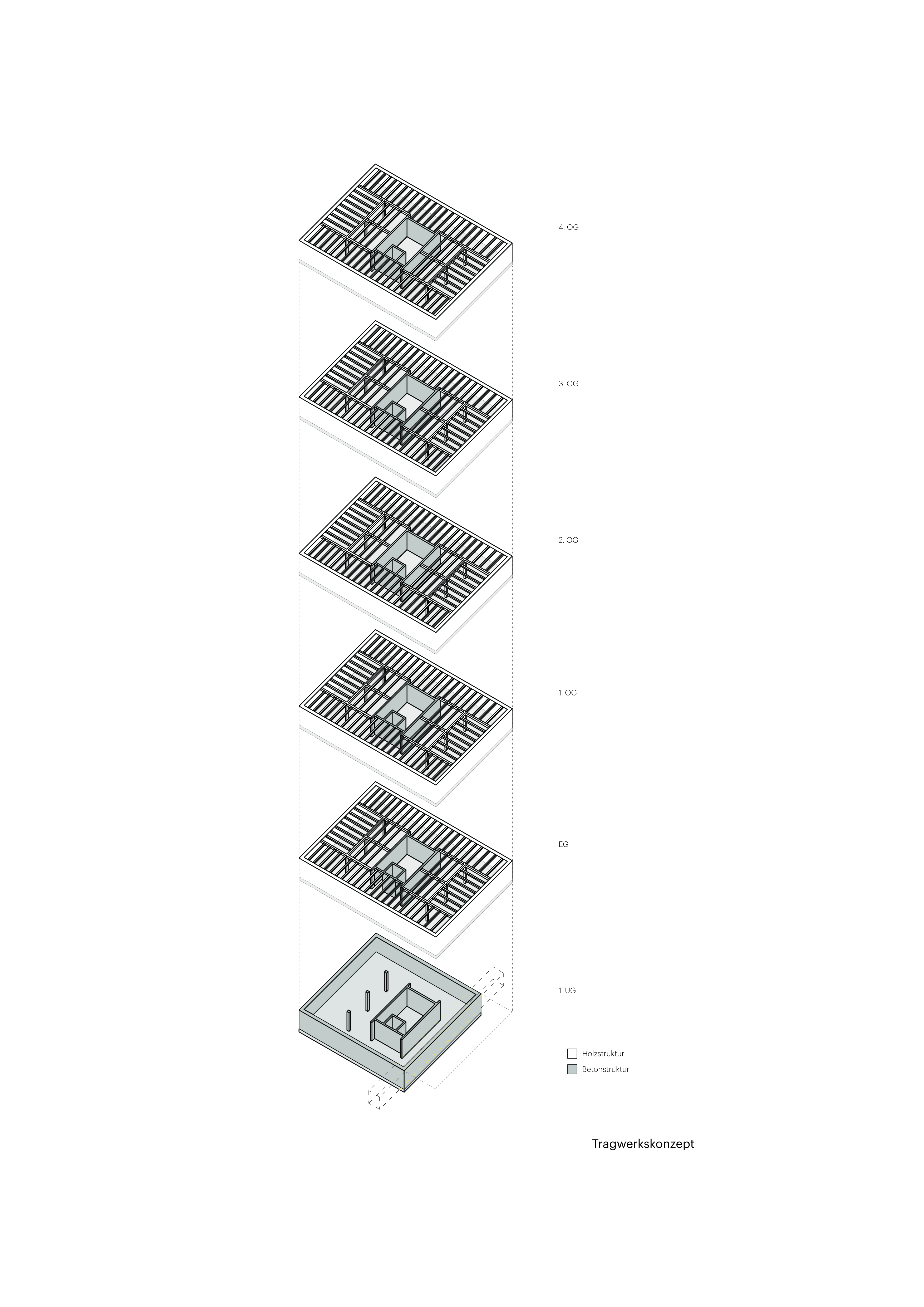 Das Gebäude ist als ressourcenschonender Holzhybridbau konzipiert.Beton wird nur dort eingesetzt,wo er konstruktiv und bauphysikalisch erforderlich ist. Holz und Holzhybridelemente bilden die oberirdische Tragstruktur und verleihen den Innenräumen Wärme und Behaglichkeit.Das Hybridsystem kombiniert Dauerhaftigkeit,Brand-und Schallschutz mit geringem CO₂-Fussabdruck, hoher Vorfertigung und angenehmem Raumklima.