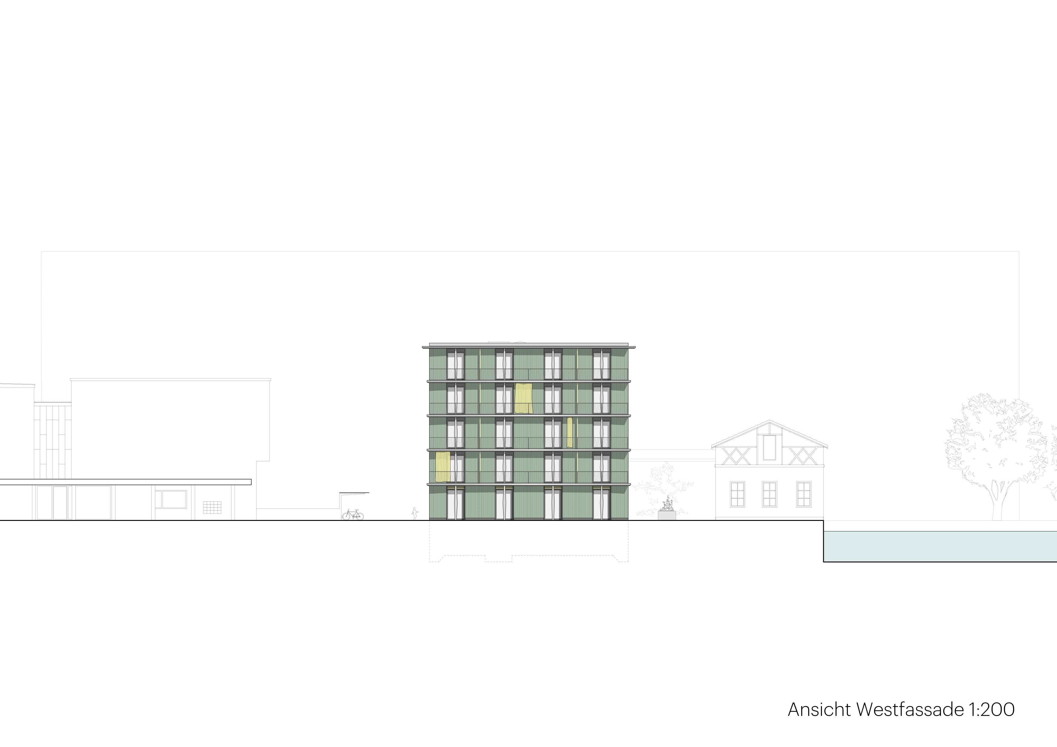 Der Neubau verbindet industrielle Robustheit mit wohnlicher Leichtigkeit. Die farbige Wellfaserzement-Fassade, die klar ablesbare Konstruktion der Geschossplatten und Balkone, textile Sonnenschutzelemente und gewobene Brüstungen schaffen ein filigranes, lebendiges Fassadenbild mit hoher Identität.