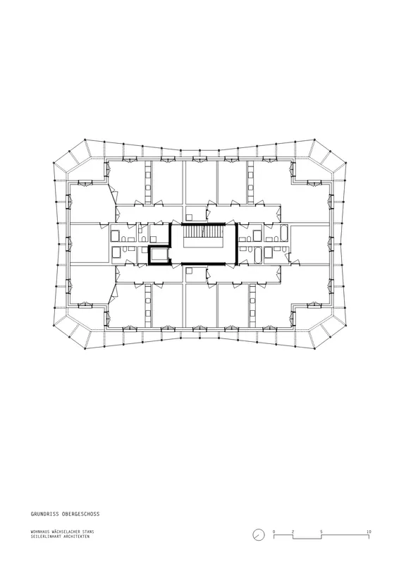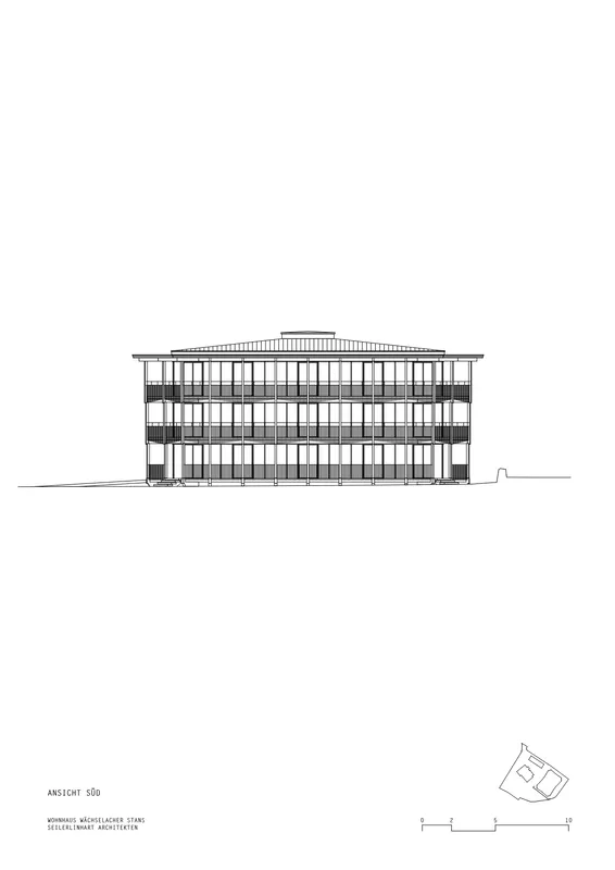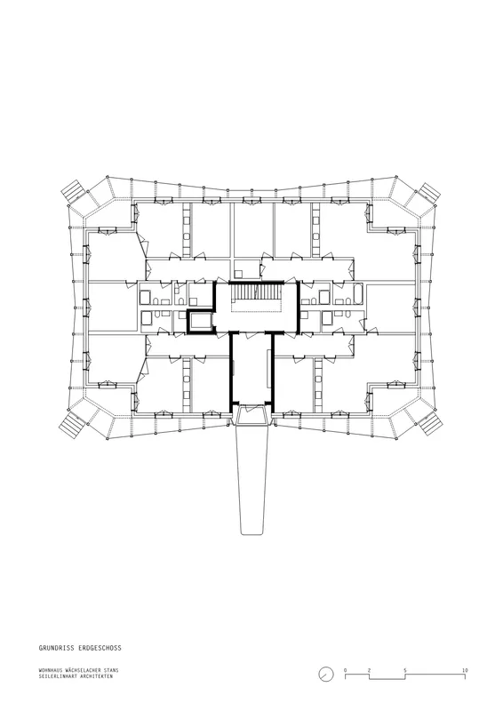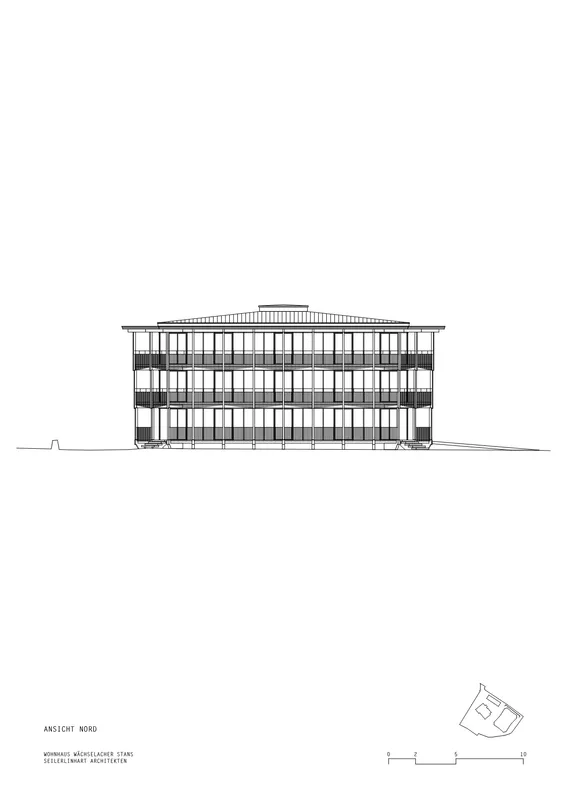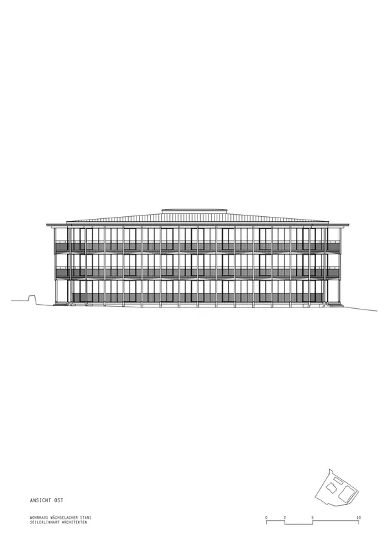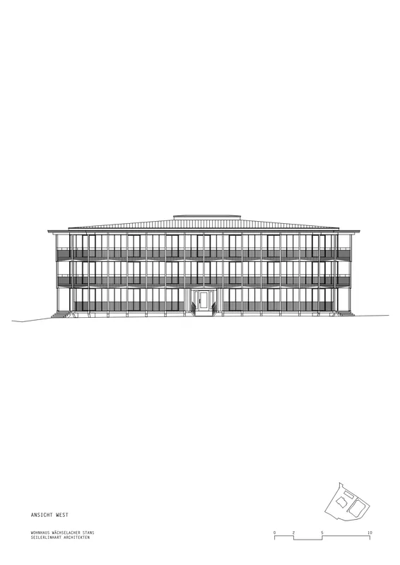 Der Zugang führt in ein zentral belichtetes Treppenhaus mit Lift, das zwölf Wohnungen erschliesst. Flexible Grundrisse ermöglichen unterschiedliche Wohnungstypen. Loggien sorgen für gute Belichtung und Privatsphäre. Ein Gemeinschaftsraum im Wächselacherhaus fördert das soziale Miteinander.