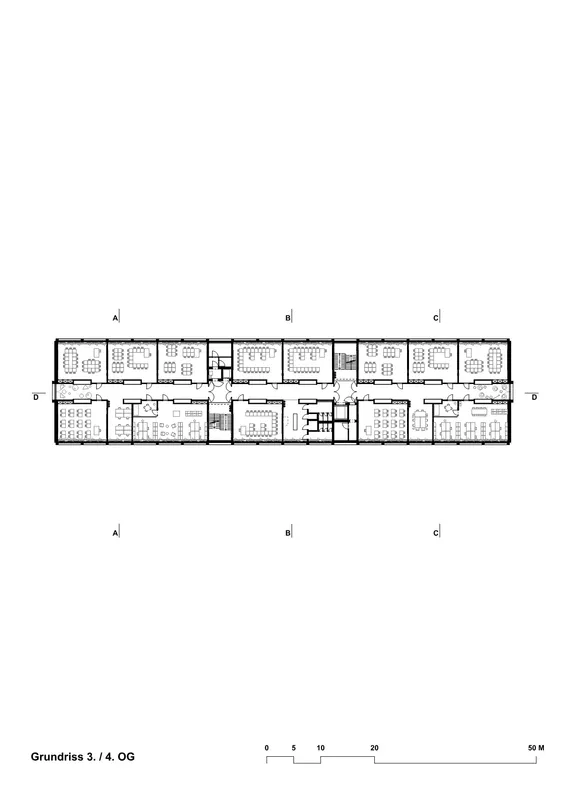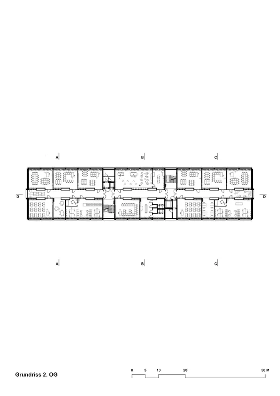 Im Zentrum des Entwurfs steht der Anspruch, optimale Bedingungen für den Unterricht zu schaffen. Die 31 Klassenzimmer erfüllen bezüglich Tageslicht, Raumakustik und -klima höchste Anforderungen. Darüber hinaus stehen flexibel nutzbare Räume für den erweiterten Unterrichten im 1. Obergeschoss, in den Korridornischen und auf dem Dach zur Verfügung. Die Gebäudestruktur kommt in den Unterrichtsgeschossen mit wenigen tragenden Stützen aus und schafft so eine hohe Flexibilität.