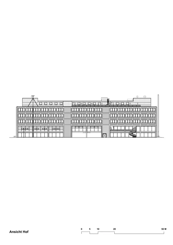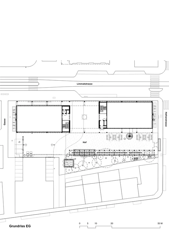 Aus dem einst düsteren, unwirtlichen Innenhof wird ein offener, einsehbaren Aufenthaltsraum. Beschattete Sitzgelegenheiten und ein Basketballplatz laden Schüler*innen und Leute, die im Quartier wohnen oder arbeiten, zum Essen und Verweilen ein. Die schlichte Ausstattung und rohe Materialisierung lehnen sich an typische Hofsituationen im Kreis 5 an. Der "Hinterhof" im ehemaligen Industriequartier wird als offener, angstfreier und begrünter Stadtraum neu interpretiert.
