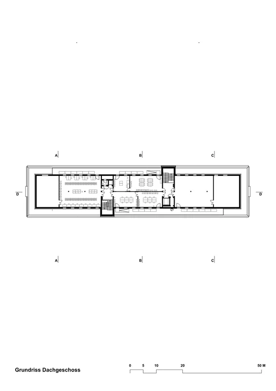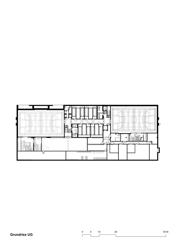 Die neue Baugewerbliche Berufsschule Zürich liegt zentral unweit des Hauptbahnhofs. Durch die Platzierung des schlanken Gebäuderiegels direkt an der Strasse entsteht ein grosszügiger, begrünter Hofraum, der sowohl der Schule als auch dem Quartier dient. So integriert sich die Schule in den Stadtraum, statt sich von ihr abzugrenzen. Die abgesenkten Turnhallen mit ihrem Luftraum im Erdgeschoss werden auch ausserhalb der Schulzeiten von Vereinen genutzt und beleben am Abend den Stadtraum. Diese Stapelung bedingt, dass die Kräfte der Obergeschosse über den Turnhallen abgefangen werden müssen. Um hohe Unterzüge zulasten des Schulraums zu vermeiden, wird das gesamte erste Obergeschoss als Fachwerkträger ausgebildet. Die diagonalen Stäbe dieser Fachwerke verleihen dem Piano nobile seine spezifische räumliche Identität. Während die Klassengeschosse darüber sehr flächeneffizient organisiert sind, bildet das Piano nobile eine offene, flexibel nutzbare Landschaft. Das Herz dieser Landschaft ist die Werkhalle – ein multifunktionaler Unterrichts-, Ausstellungs- und Veranstaltungsraum –, die in engem Austausch mit den Nutzenden entwickelt wurde.
