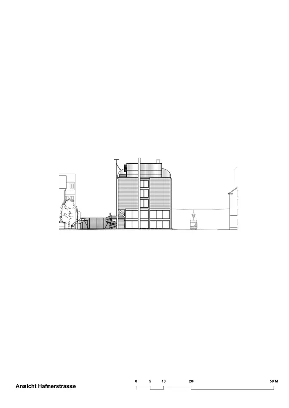 Häusern aus dem 19. Jahrhundert an der Hafnerstrasse. Die beidseitigen Kolonnaden und dem Durchgang verweben das Gebäude mit dem Stadtraum und schaffen in alle Richtungen neue Vernetzungen im Quartier.
