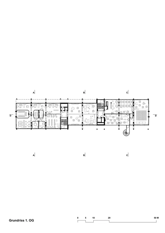 Das flexibel nutzerbare 1. Obergeschoss ist über die Loggia und die grosse Wendeltreppe direkt mit dem Hofraum verbunden. So kann die Öffentlichkeit, während und ausserhalb der Unterrichtszeiten, in vielfältiger Weise mit den Aktivitäten der Schule in Austausch treten.