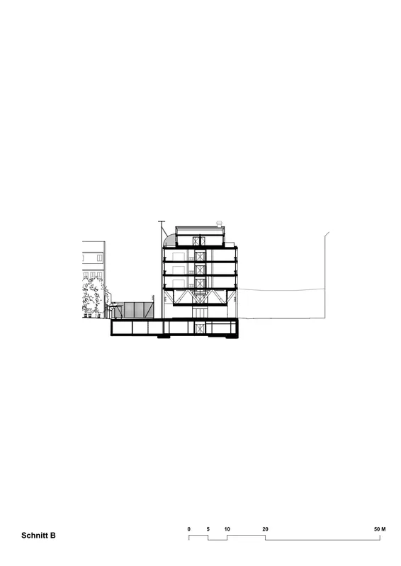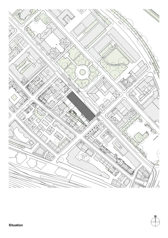 Die schlichte Gebäudekörper führt die Fassadenflucht entlang der Limmatstrasse weiter. Der Klingenpark, diagonal versetzt auf der anderen Strassenseite, wird in der ursprünglichen stadträumlichen Absicht erhalten.