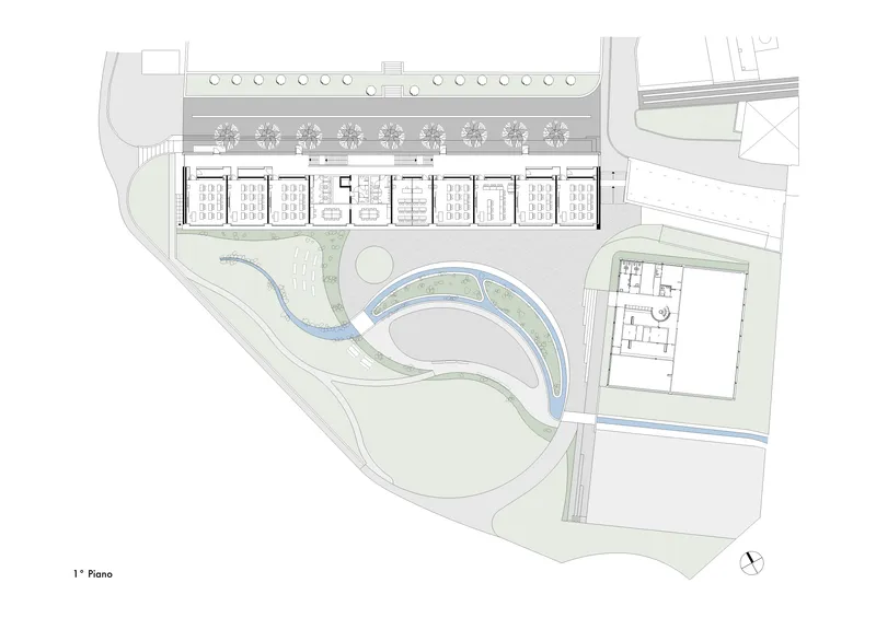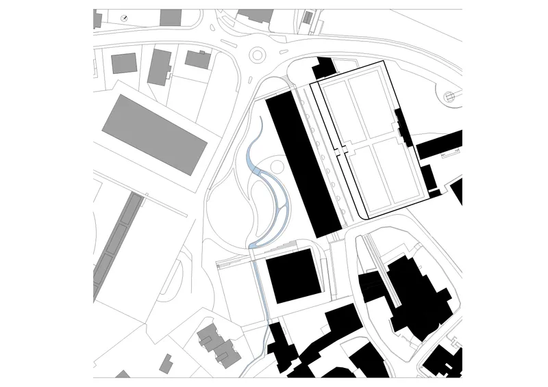 La nuova sede scolastica è concepita come un’infrastruttura integrata nel contesto circostante, che comprende a nord il complesso monumentale del cimitero e la chiesa parrocchiale di Santo Stefano, a est la palestra esistente e a sud il percorso che collega gli impianti sportivi. L’edificio si allinea parallelamente al muro di cinta del cimitero, seguendone esattamente la lunghezza e ridefinendo una piazza allungata che ne rafforza il collegamento con la chiesa. Sul lato sud, un nuovo parco pubblico dove scorre il riale San Giovanno rinaturalizzato diventa polmone verde per la comunità.