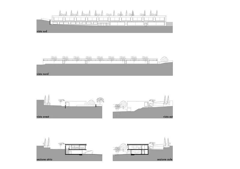 La nuova sede scolastica è concepita come un’infrastruttura integrata nel contesto circostante: a nord il complesso monumentale del cimitero e della chiesa parrocchiale di Santo Stefano, a est la palestra esistente, e a sud il percorso che collega gli impianti sportivi. La convergenza di questi percorsi nel parco pubblico ne fa il nuovo centro d’incontro di Tesserete.