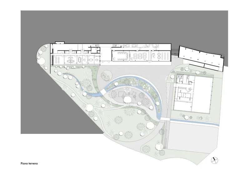Il piazzale delle scuole, è pensato come luogo di incontro e transito pedonale, con pavimentazioni permeabili e alberature strategiche per ombreggiare e mitigare il calore mentre il parco giochi, integrato con il riale San Giovanni rinaturato – un corso d’acqua precedentemente intubato - oltre a rispondere ai nuovi dettami della “città spugna” diventa un laboratorio di natura per i bambini: un’area educativa e ricreativa dove l’acqua, le piante e i materiali naturali sono protagonisti.